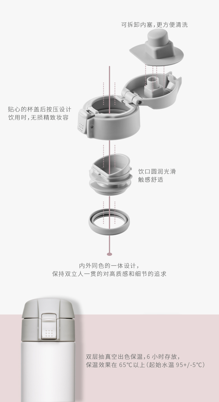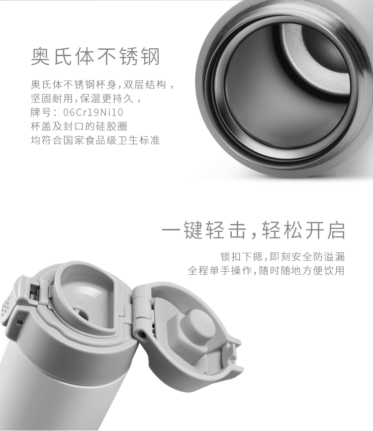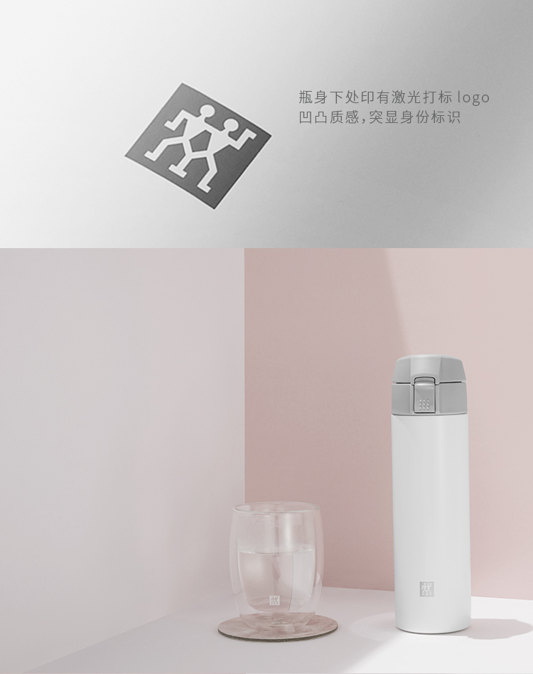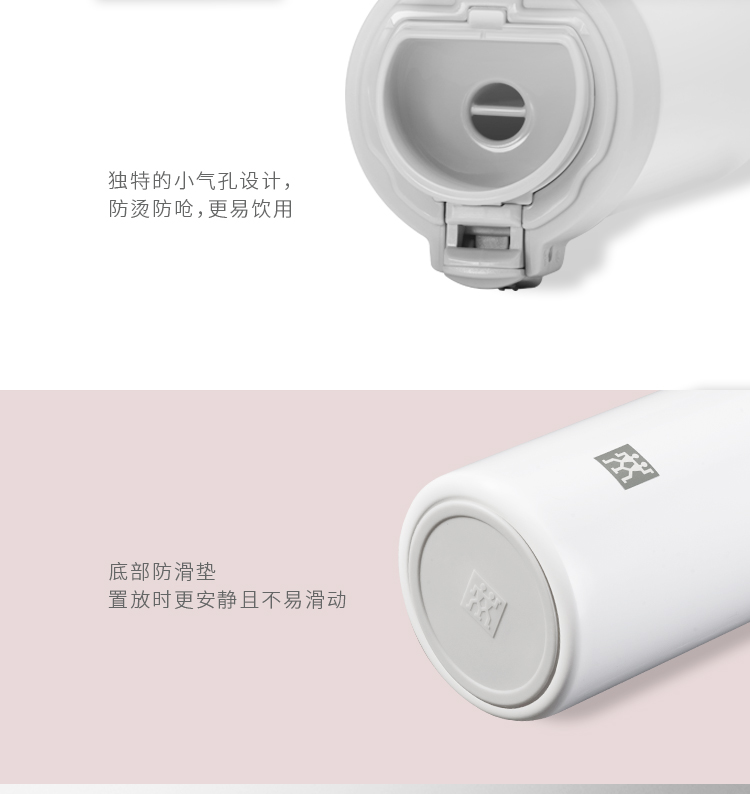 双立人 星享系列 双层真空保温杯,304奥氏体杯身,双层真空结构,可长时间保温保冷,95±5℃热水,6小时保温效果在65℃以上。弹跳杯盖,一键轻击,轻松开启,贴心杯盖后压设计,饮用时无损精致妆容,饮口圆润光滑,触感舒适,独特的小气孔设计,防烫防呛,更易饮用,底部防滑垫,置放安静不易滑动。杯身印有激光打标LOGO,凹凸质感彰显身份。