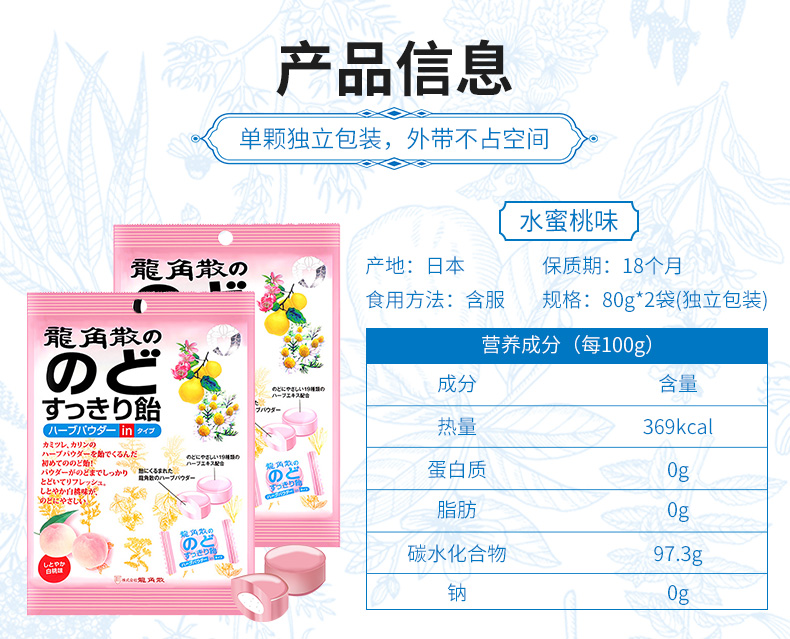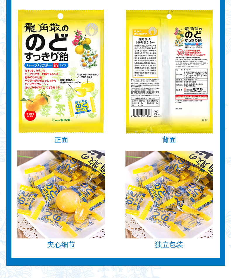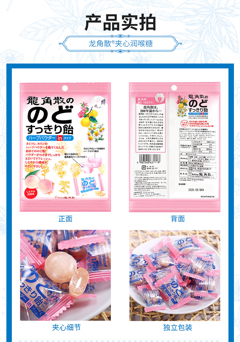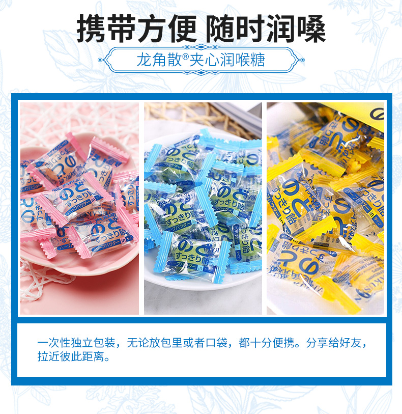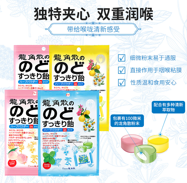这款龙角散 夹心润喉糖,日本原装进口,是粉末和夹心的双重润嗓,直接作用于咽喉粘膜,性质温和,食用安全。添加的龙角散草本微粉均匀散布在润喉糖中,配合有益于咽喉的清新草本萃取物,持久护嗓。