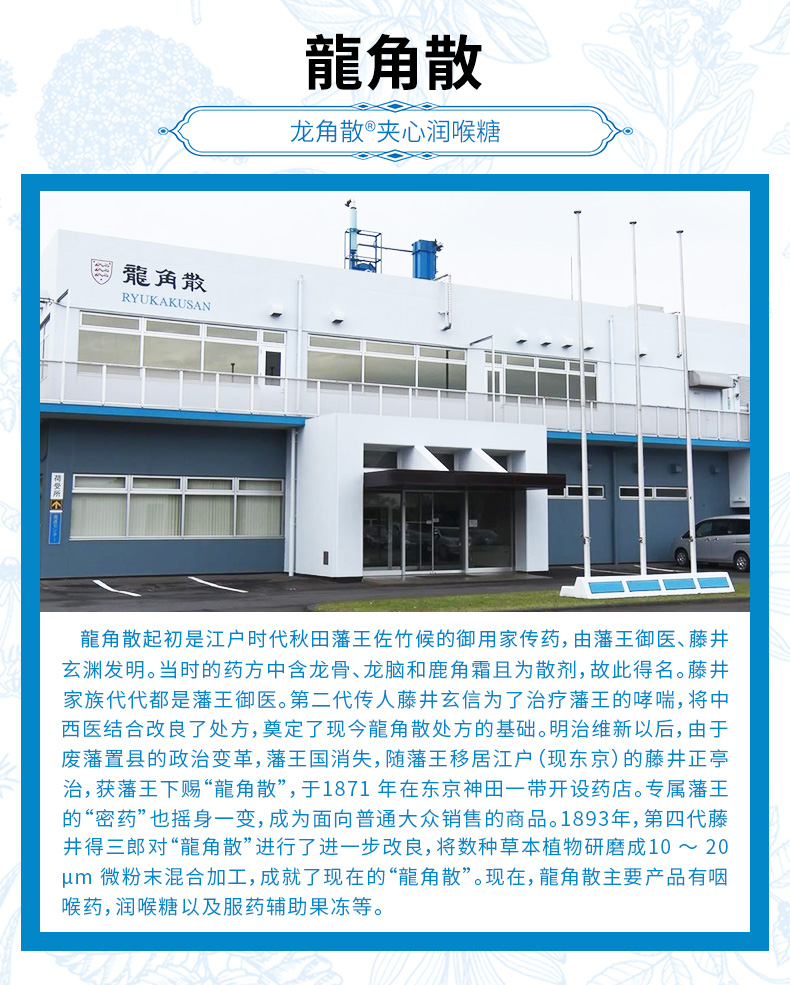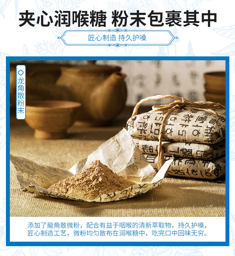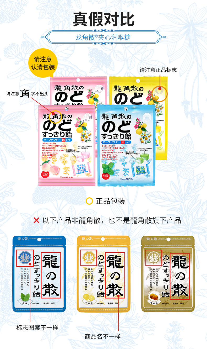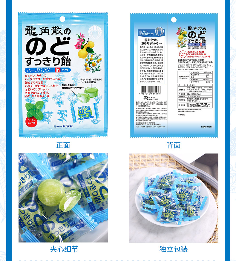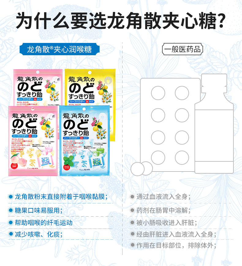 特别的龙角散生药配合,100微米细的龙角散粉末包覆于润喉糖的中心,瞬间滋润不适喉咙,对于除痰止咳,清肺、痰多,咽喉肿痛、咽喉炎症有一定的功效,特别是换季的时候,早晚温差大,容易引起长久的干咳和痰咳,家中常备药品。