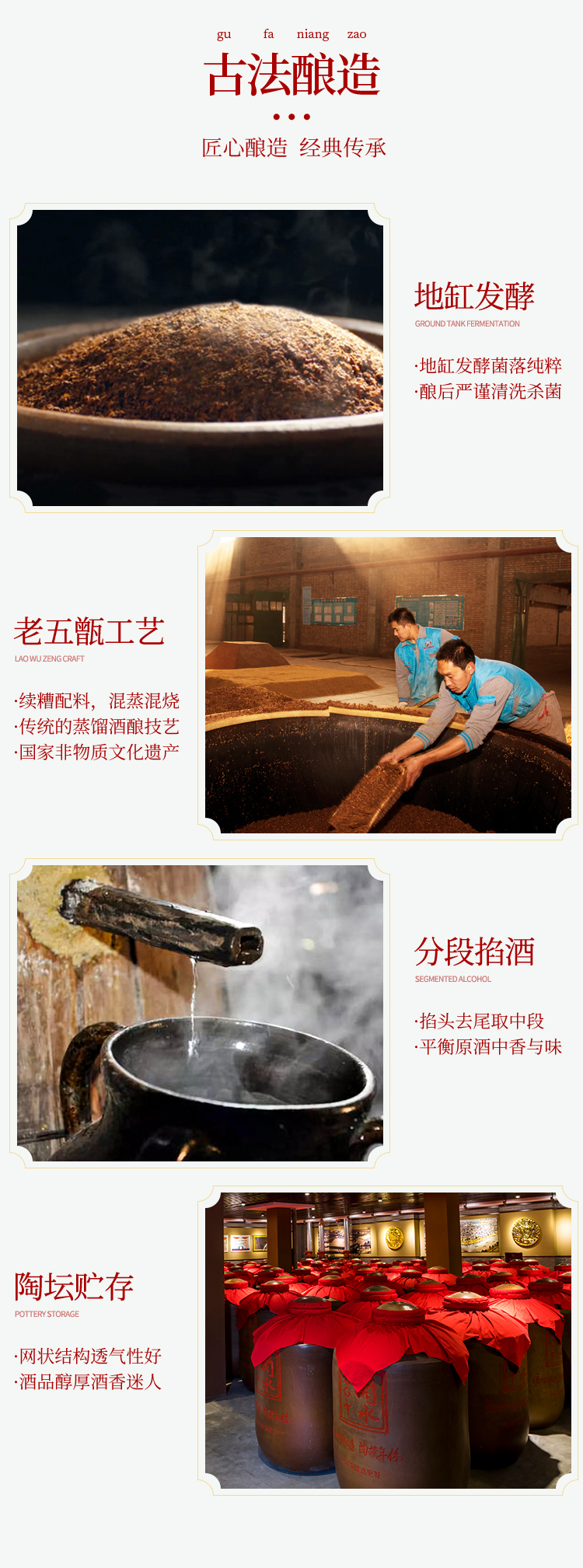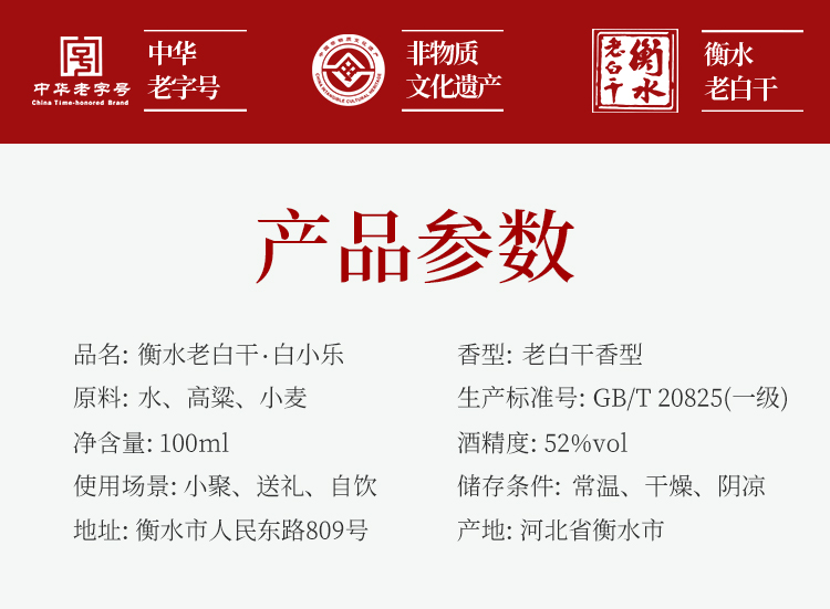 52度老白干香型,GB/T 20825 (一级)标准,采用东北优质红高粱、小麦为原料,老五甑工艺,地缸发酵,陶坛储存,酒品醇厚香气迷人,适合酒友尝鲜。