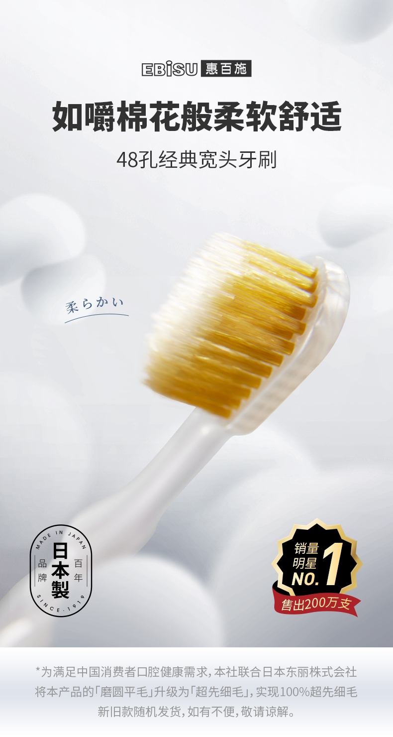 这款牙刷48孔大宽头设计,毛孔数是普通刷头的1.8倍,能大面积的覆盖上下牙齿和牙龈,双层不同柔软度的刷毛设计,柔与力兼施,清洁与按摩兼备,呵护娇嫩牙龈。同时也是平尖两种刷毛的组合,丝径20微米的「超纤细尖毛」,能深入清洁牙龈沟,「平切毛」能清洁齿面色渍和污垢。