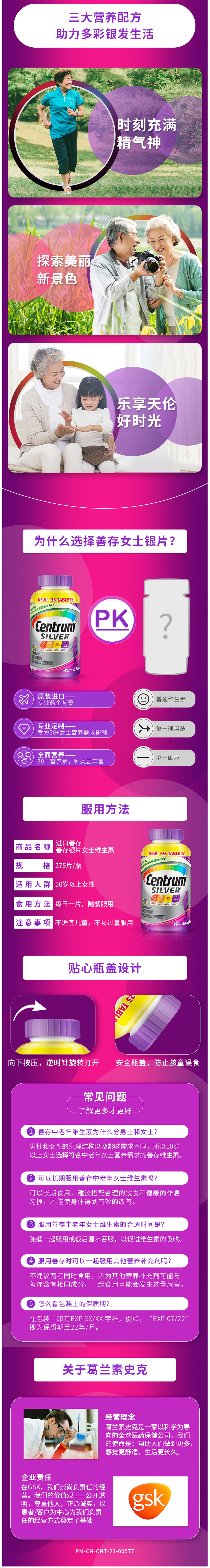 这款善存银片,美国原瓶进口,专为50岁以上中老年女士制定,复合13种维生、叶黄素、16种矿物质,富含钙、镁、硒等营养元素,加强了老年人所需的抗氧化营养素,有助增强免疫力,维护心血管健康,保护大脑,适合眼睛容易疲劳干涩、易疲劳、体力下降,易焦虑人群。