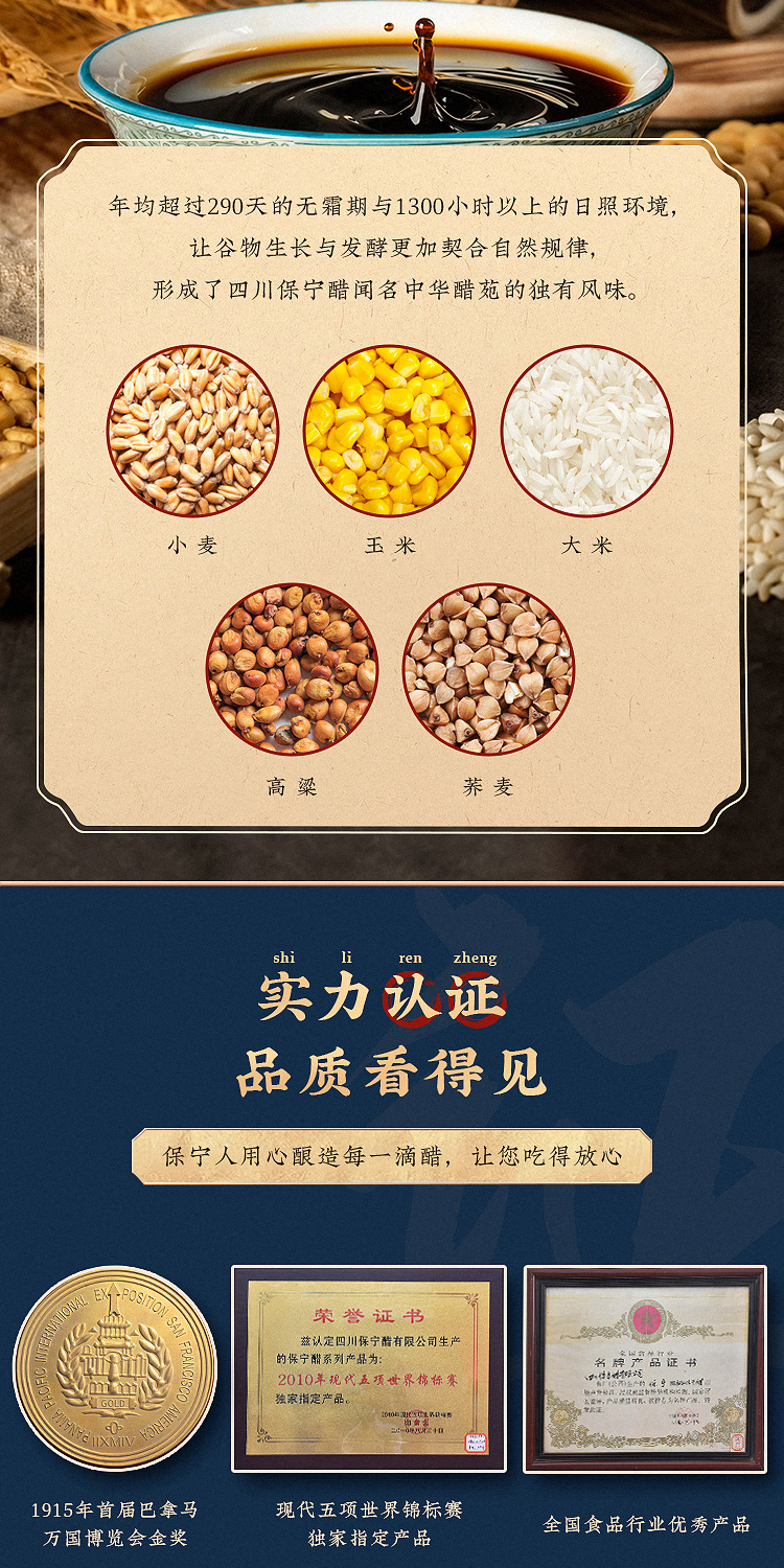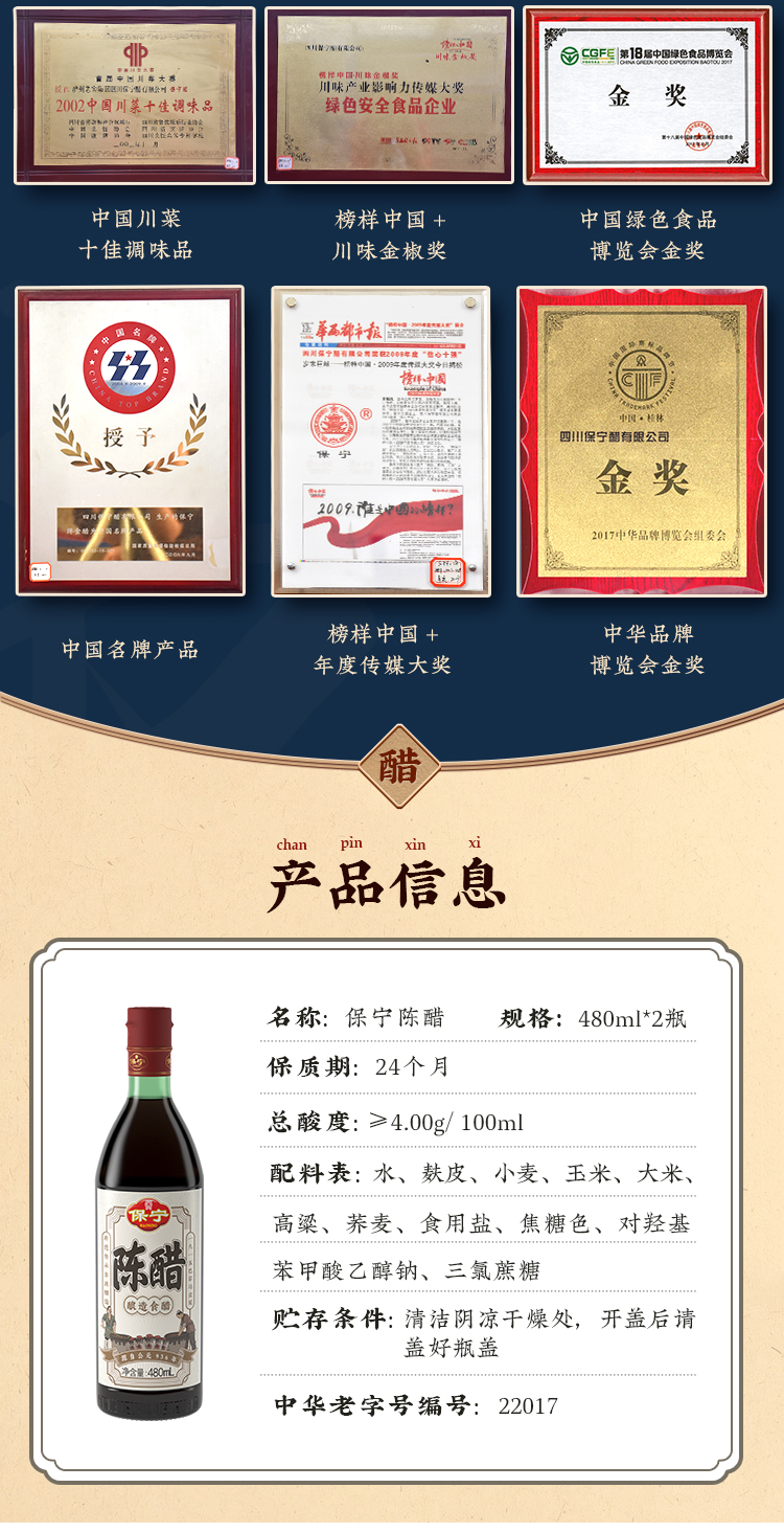 保宁醋是全国四大名醋(阆中保宁醋、山西老陈醋、江苏镇江香醋、福建米醋之一)。它以历史悠久,质优味美、营养丰富、防病治病而著称于世,在1915年巴拿马“太平洋万国博展会”上获金质奖。