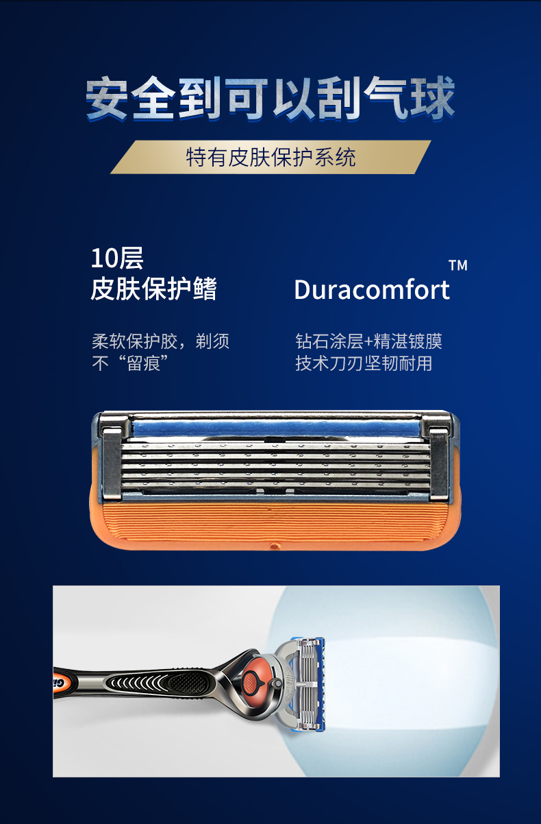 这款是吉列手动剃须刀系列中的经典款式,纳米超薄刀片,钻石涂层镀膜刀刃持久顺滑,5层刀头排列设计,智能悬浮分散压力,配合显示型芦荟亲肤润滑条(2~3个月润滑条颜色变淡即提示更换刀头),加宽的柔软皮肤保护鳍,帮助竖起须根,让剃须更顺贴,剃须的同时保护肌肤。