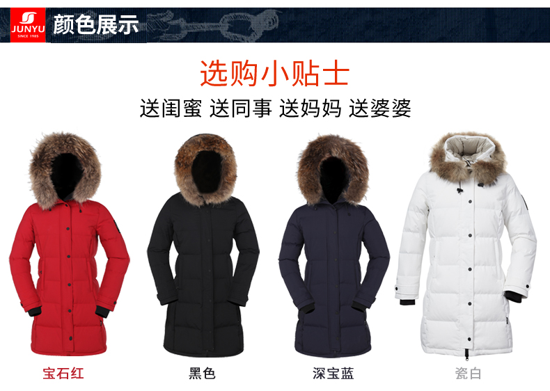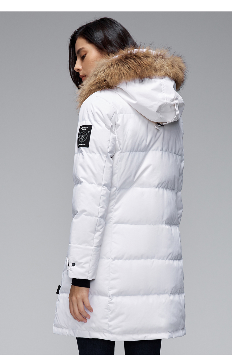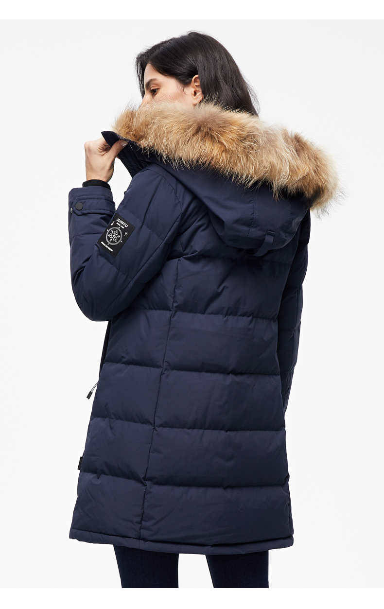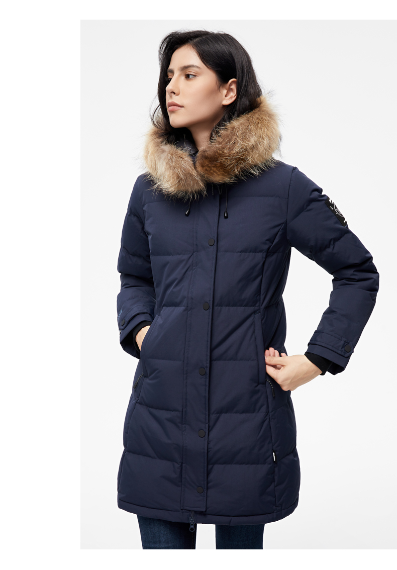 这款君羽雪岩女中长款羽绒服,属于严寒系列,可抗0℃~-15℃,是2018年的冬季款,内里填充了800蓬90%鹅绒,M码充绒177克,属于中厚款羽绒服,外层是高密度耐磨锦纶布,伴有压胶加持,可防风防雨雪。直筒微收腰版型,长度过臀及大腿。