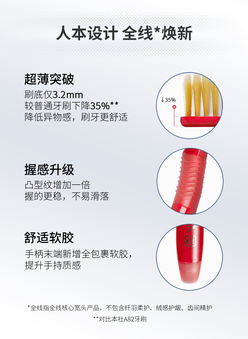 这款牙刷48孔大宽头设计,毛孔数是普通刷头的1.8倍,能大面积的覆盖上下牙齿和牙龈,双层不同柔软度的刷毛设计,柔与力兼施,清洁与按摩兼备,呵护娇嫩牙龈。同时也是平尖两种刷毛的组合,丝径20微米的「超纤细尖毛」,能深入清洁牙龈沟,「平切毛」能清洁齿面色渍和污垢。