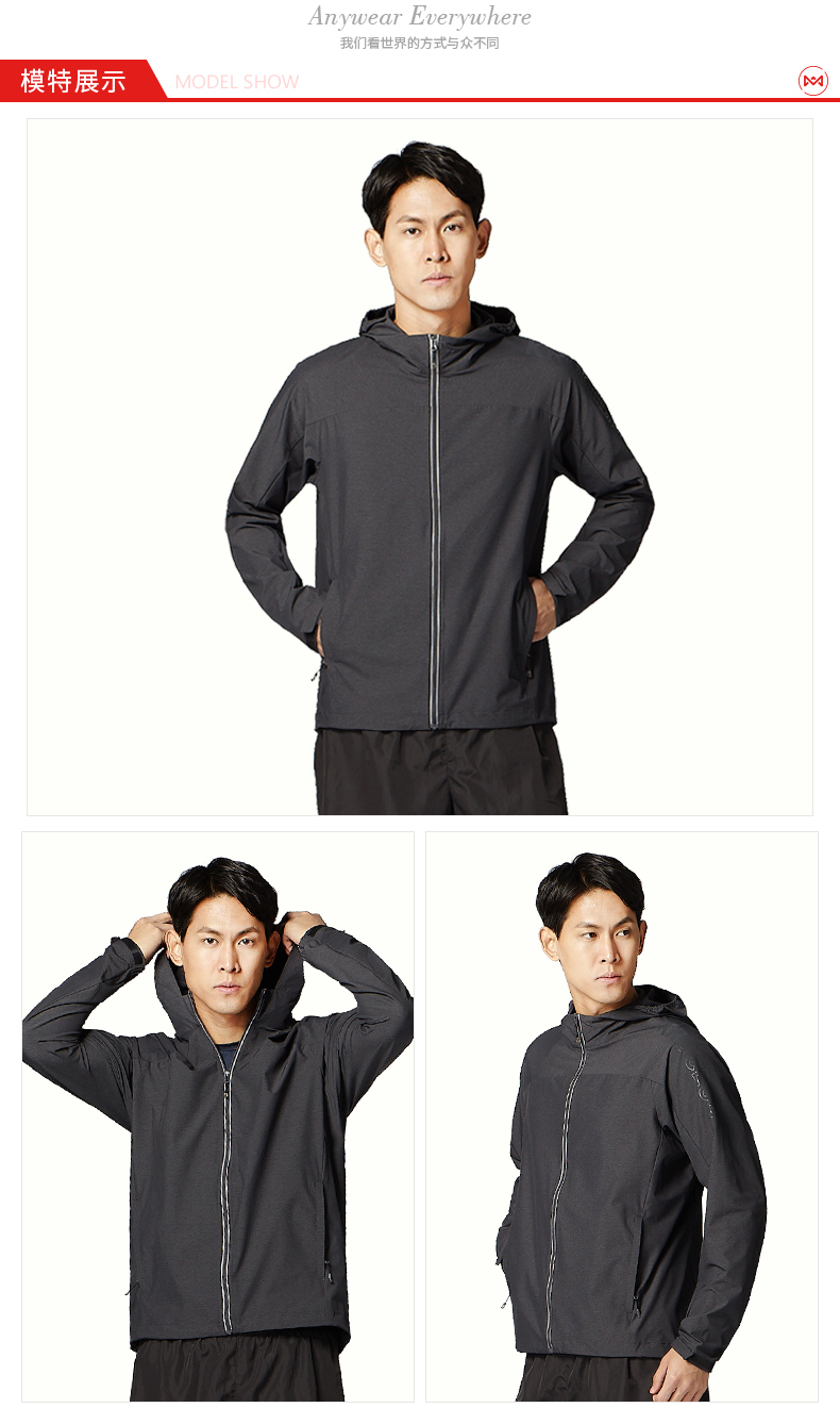 这款连帽外套是锦纶+聚酯混纺而成,耐穿速干透气,拥有四向弹力,后身还有透气孔。