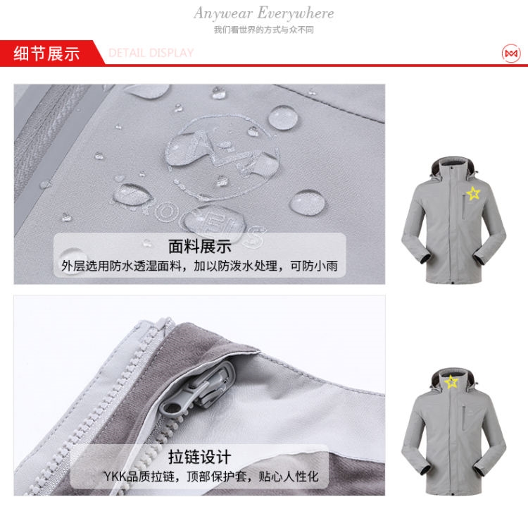 所谓的三合一也叫两件套冲锋衣,其实是两件衣服,外层是具有防风防水功能的冲锋衣,带三合一系统,里面多出来一套拉链,可以和里层的抓绒(或棉服、羽绒服)拉在一起,这样能当成一件穿,同时具有(单穿内胆、单穿外层、两件一起穿)三种穿法。