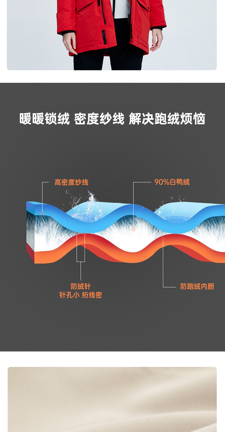 这款羽绒服,复古时尚工装风设计、面料采用长丝和短纤交织工艺,手感软糯且富有棉感,同时防磨耐刮,隔绝风雪,内填充的是大绒朵绒,90白鸭绒,且羽绒经过多道工序、清洗、高温除菌,干净卫生无异味。充绒量L码高达220g,抵御严寒不惧风雪,在南方不太冷的情况下,简单内衣就可满足保暖需求。