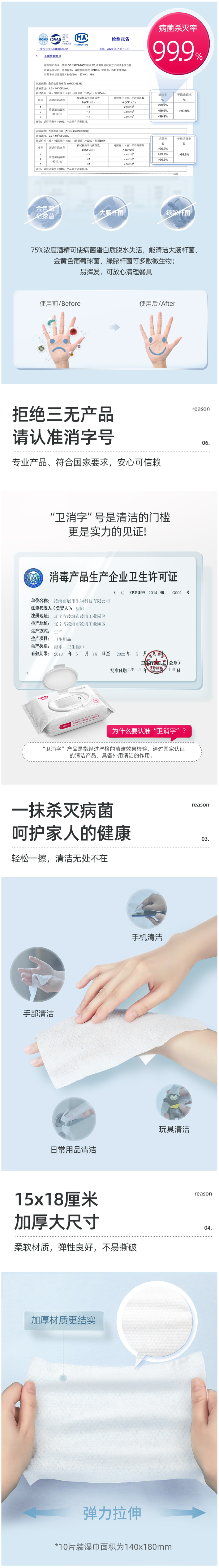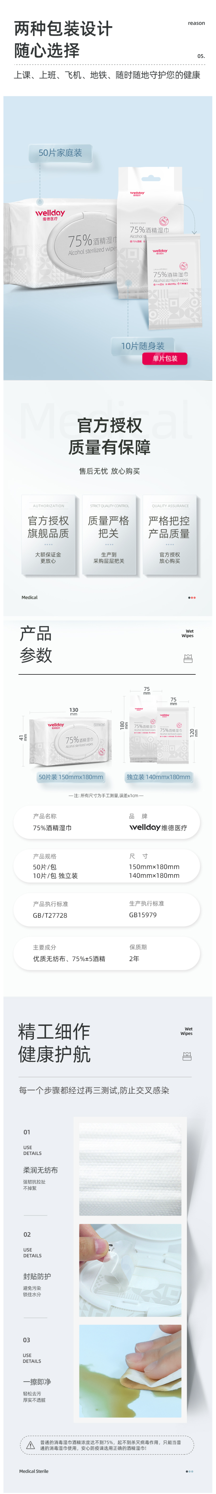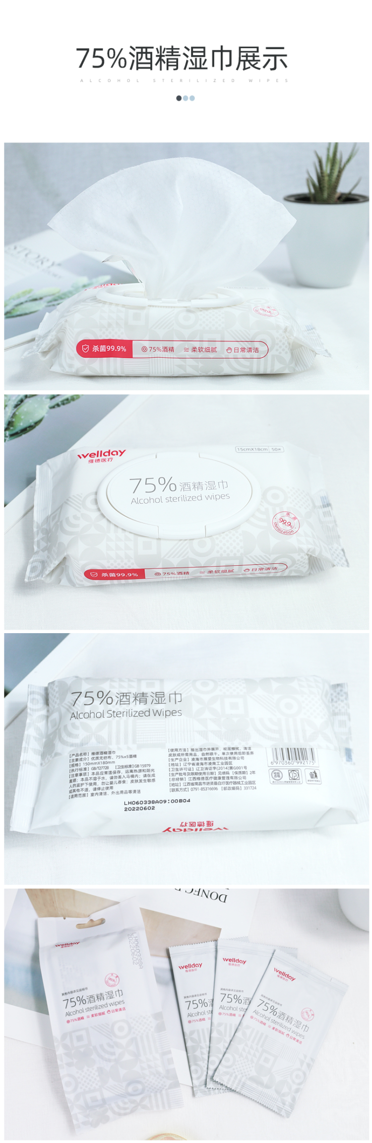 这款维德医疗 75%酒精湿巾,医用级标准,含75%酒精,杀菌率99.9%,消毒同时亲肤柔韧,加厚材质,柔软有弹性,不易撕破,袋装设计,方便携带,开盖易抽,单片尺寸15*18cm。