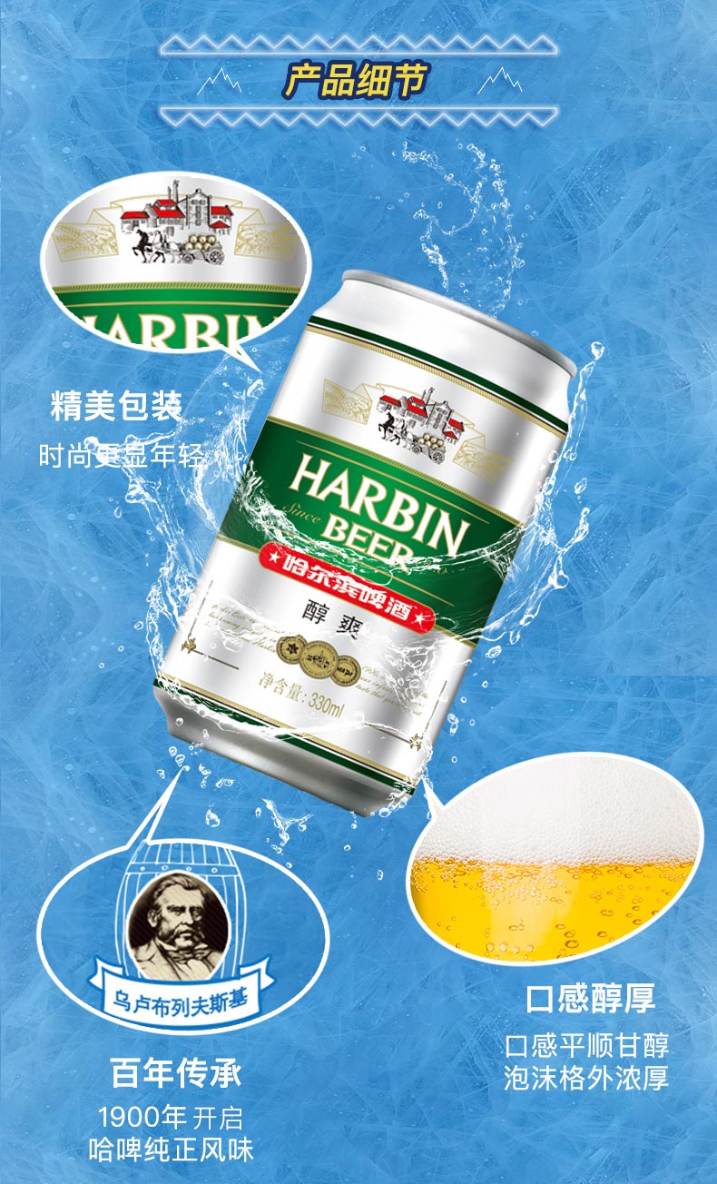 哈尔滨啤酒,诞生于1900年,由俄罗斯商人乌卢布列夫斯基创建。现在隶属百威英博啤酒集团旗下,是国内较早的啤酒品牌,拥有冰纯、小麦王、冰爽等系列产品。