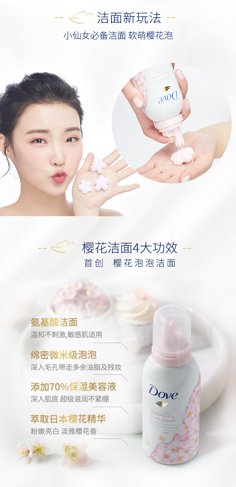 这款 多芬 樱花慕丝系列洁面泡沫套装,规格:150ml*2瓶,40%滋养美容液提升保湿能力,氨基酸配方,无皂基温和清洁面部污垢,质地温和,洗完不紧绷。起泡瓶设计,泡沫质地细腻,泡沫分子是传统的1/3能够有效清洁毛孔。