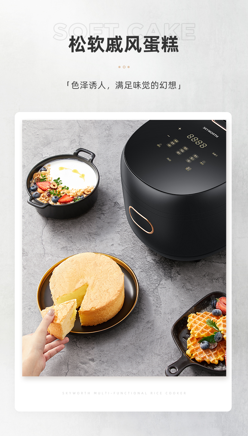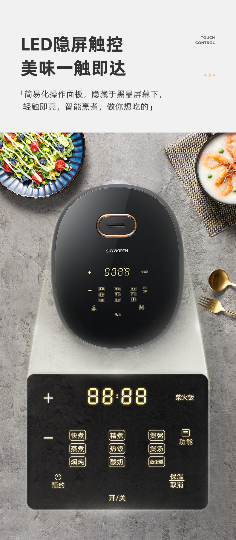创维 多功能电饭煲,容量为5L大容量,能满足多口之家使用,一锅双胆,6层复合结构、受热均匀不易变形,聚能锁热,智能曲线加热熬煮,热力直达米芯,米饭更加甘香。LED触屏,一键操作、老人也可轻松操作。