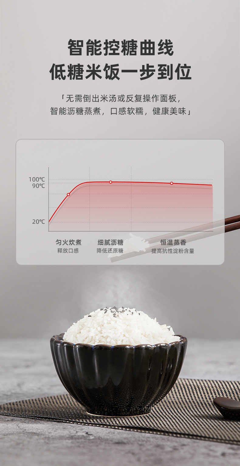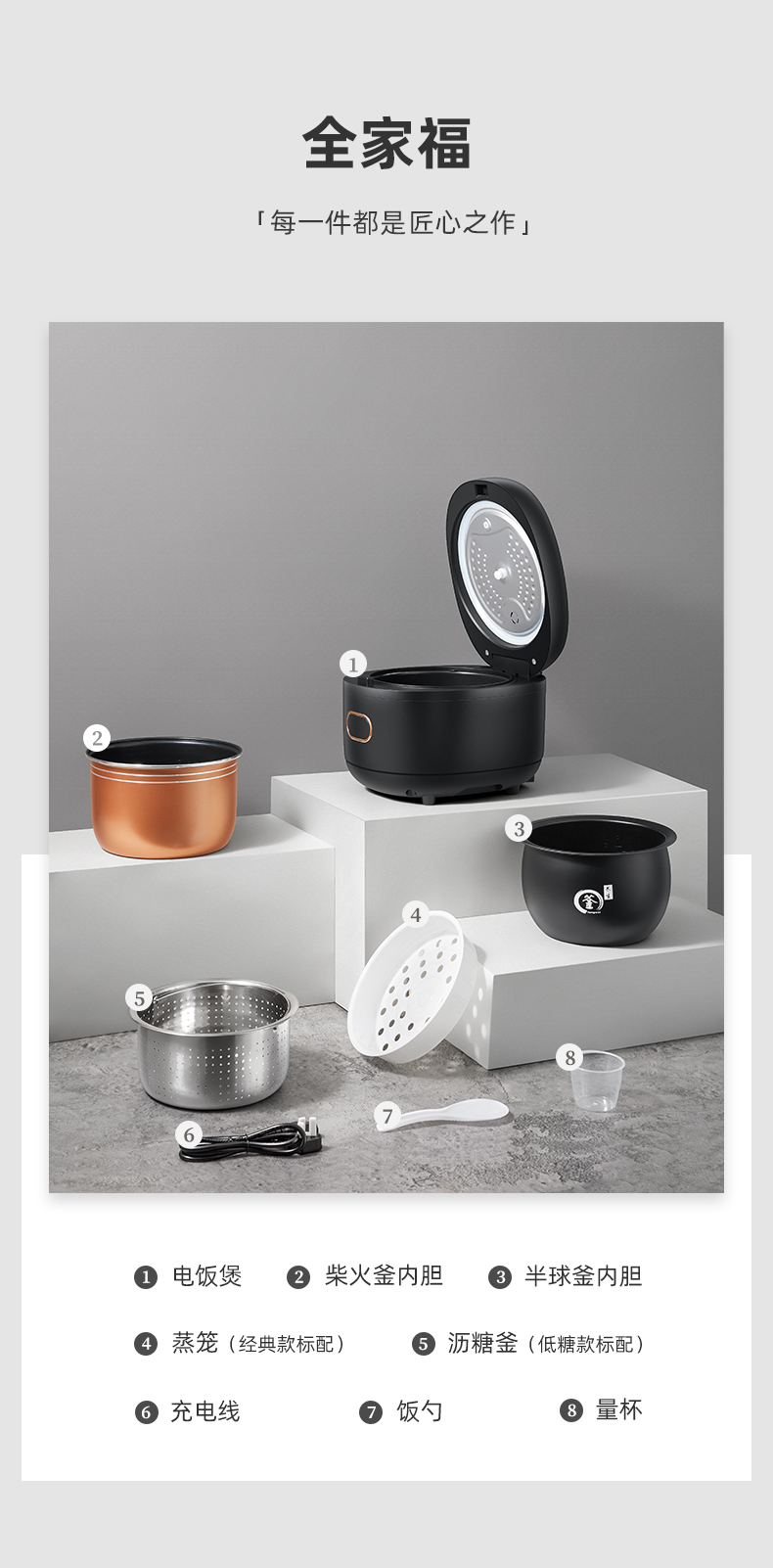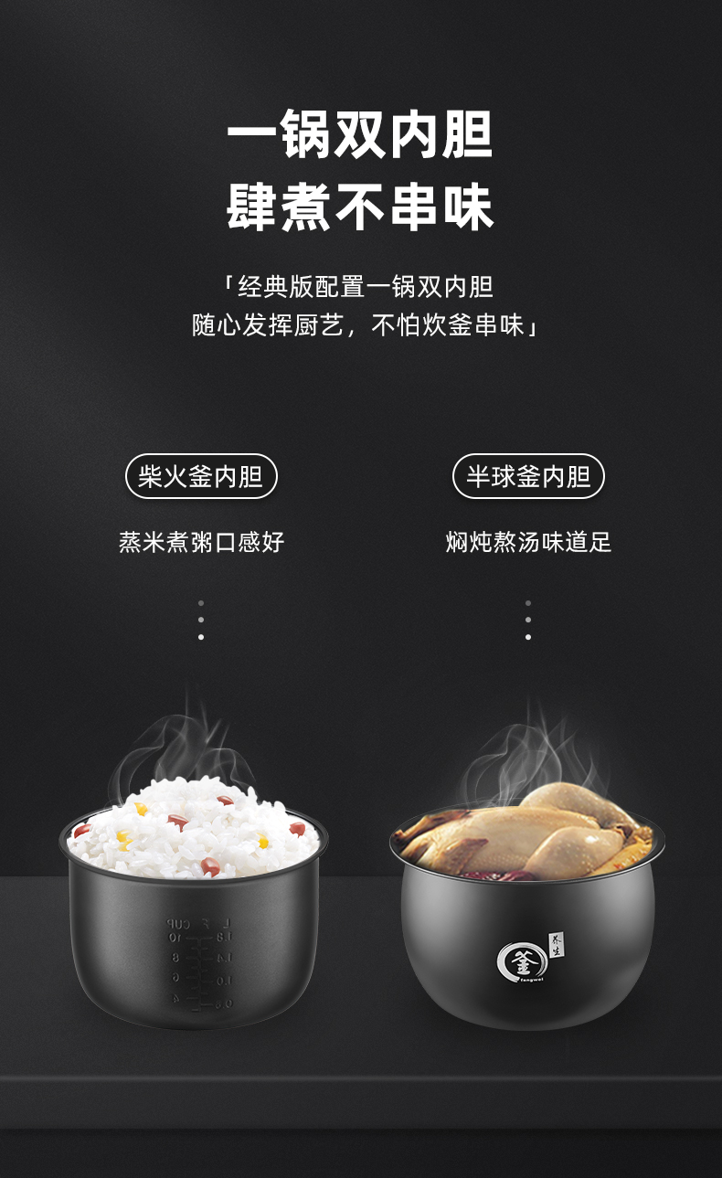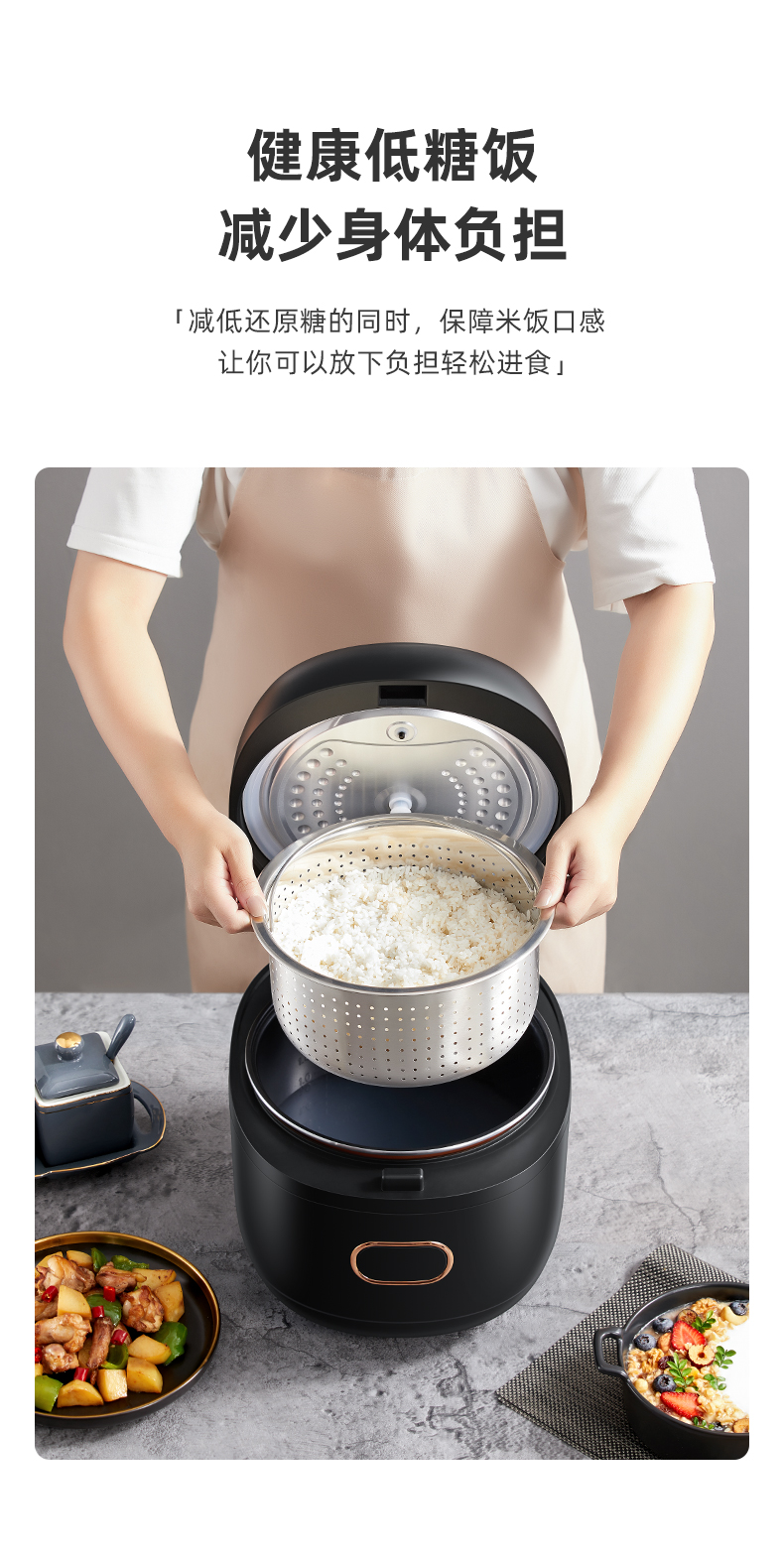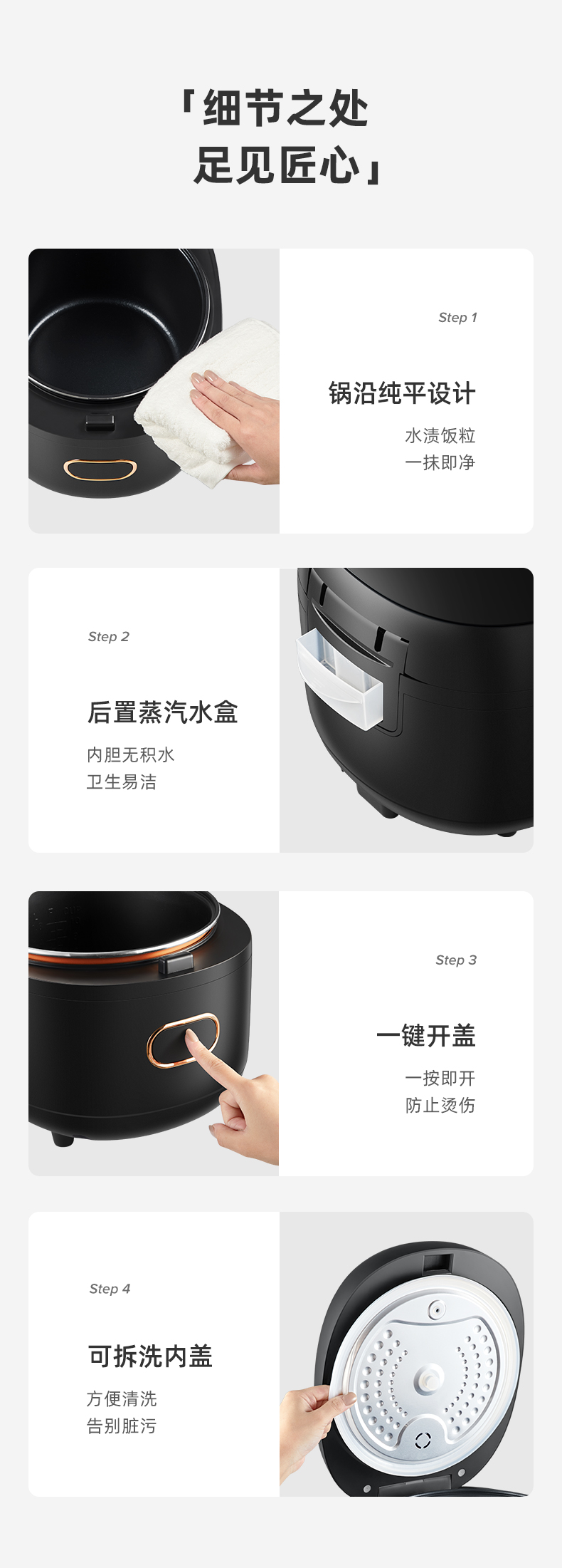 细节上:锅沿纯平设计,水渍饭粒一抹即净,后置蒸汽水盒,内胆无积水,卫生打理更方便,可24小时智能预约,提前放好食材,设置时间,早起不冲忙,下班不久等。