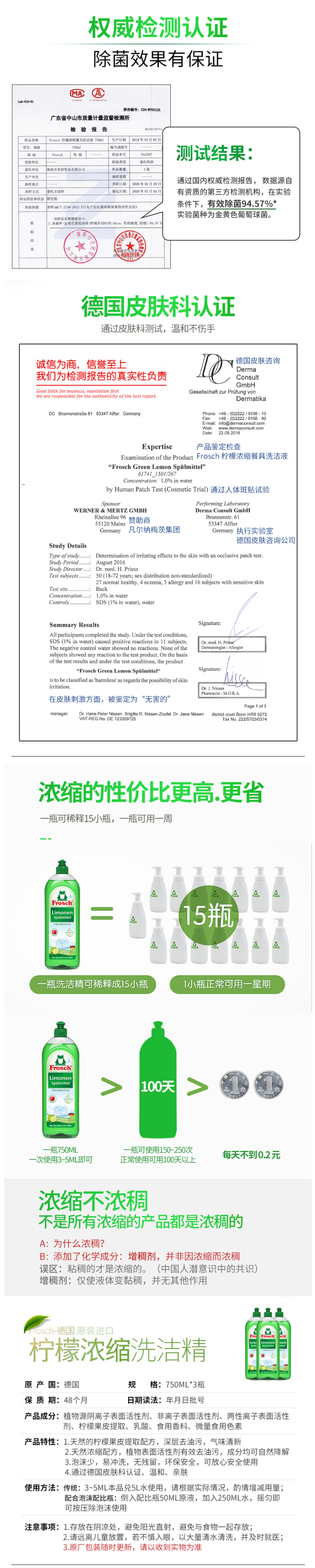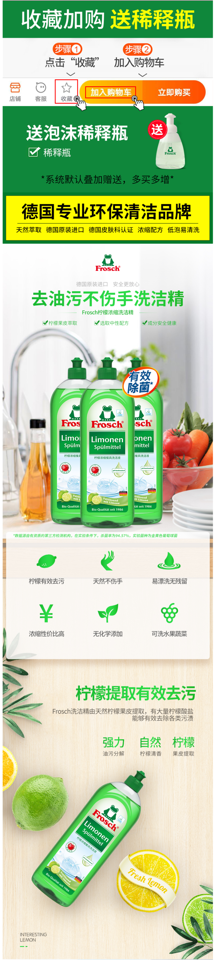 这款Frosch 柠檬浓缩洗洁精,萃取天然柠檬果皮精华,可迅速瓦解油污去异味、低泡浓缩强水溶性,轻松过水,碗具更洁净,产品高浓缩技术,不添加增稠剂,3-5ml可兑5L水,高效清洁的同时,保养洗济对象;瓶身可自然降解,环境零负担;使用之后,手感温润,拒绝干燥、紧绷甚至过敏反应。