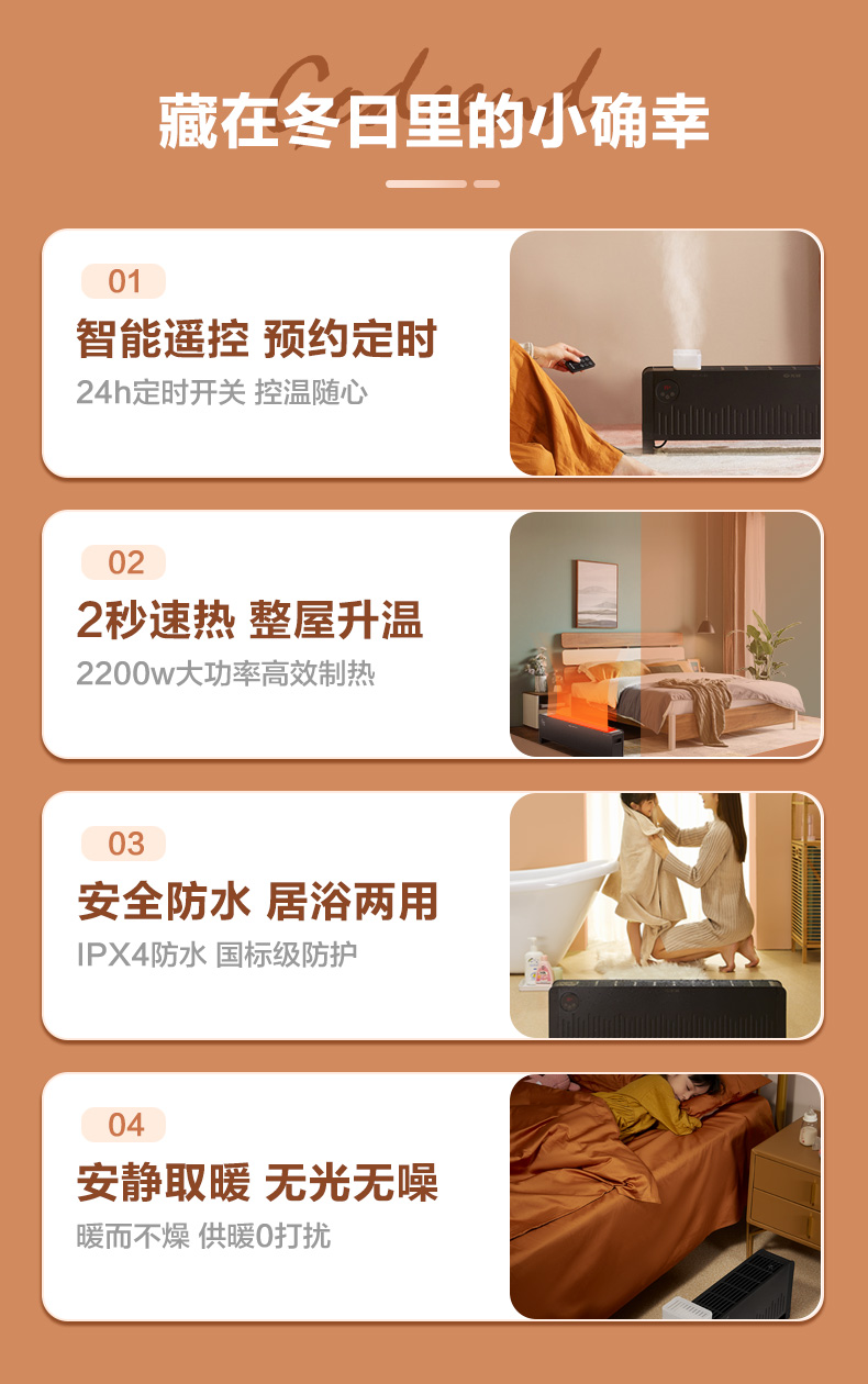 2200w大功率整屋升温,柔暖速热不干燥。一体式液晶操控面板,叠加远程遥控功能,支持24H长时间定时,睡前定时,不用起夜,使用方便。