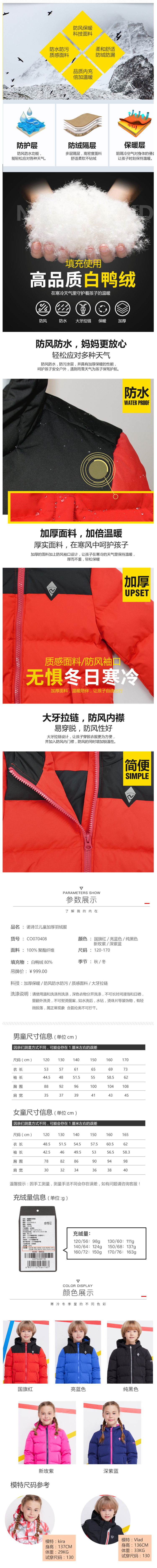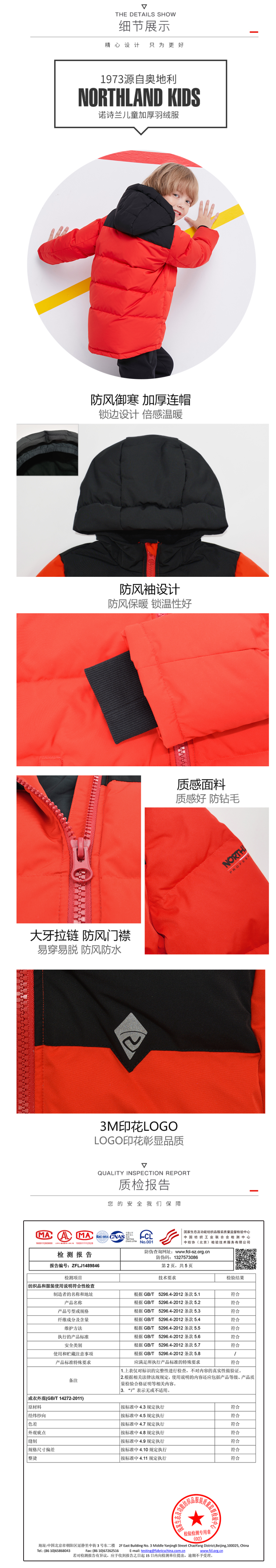 这款诺诗兰儿童羽绒服,表布是100%聚酯纤维面料,能防风防水,特地进行了加厚设计,使用多层隔层填充,防钻绒的同时也能更好的保暖。内里填充80%的白鸭绒,蓬松度高于国家标准的21%,穿着轻盈舒适,轻暖无负担。