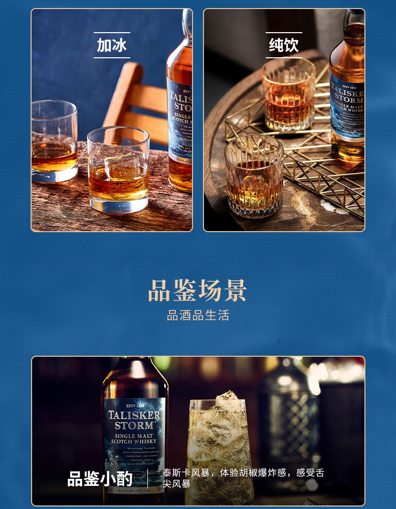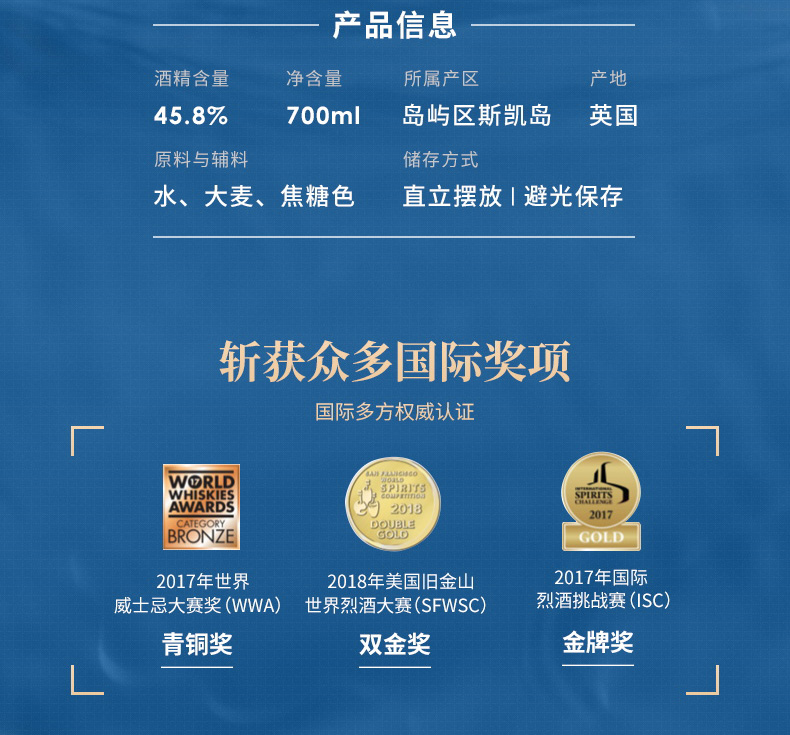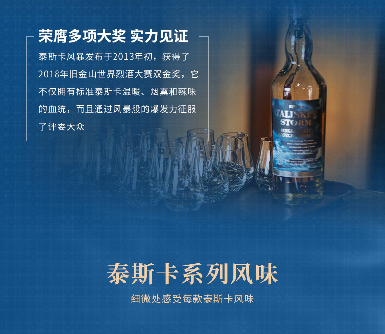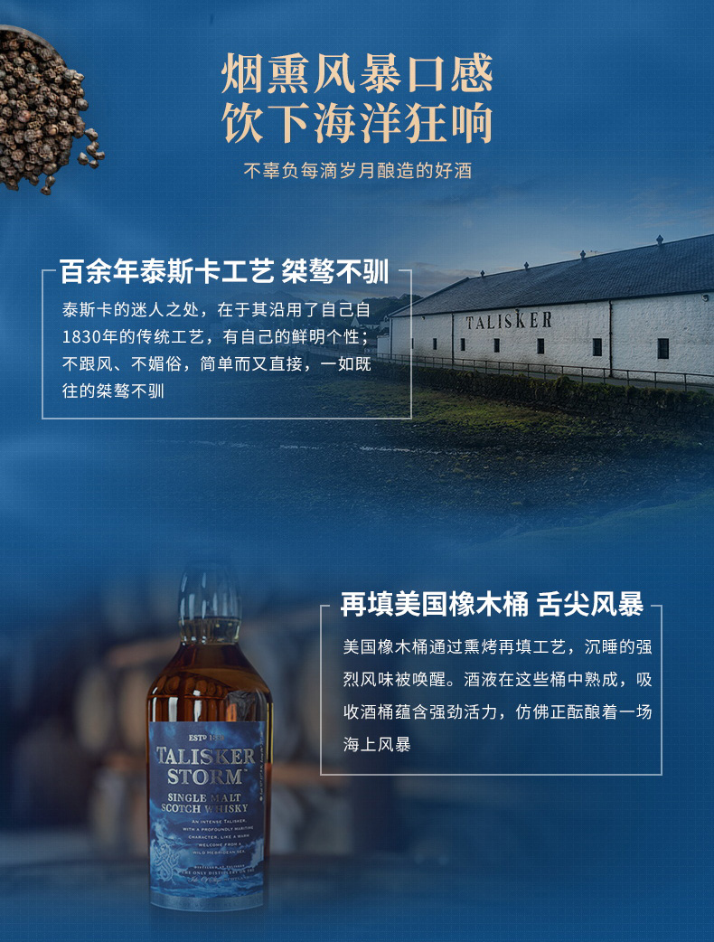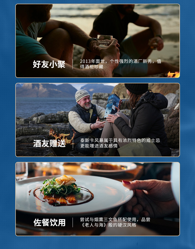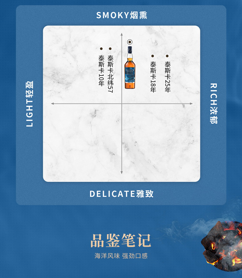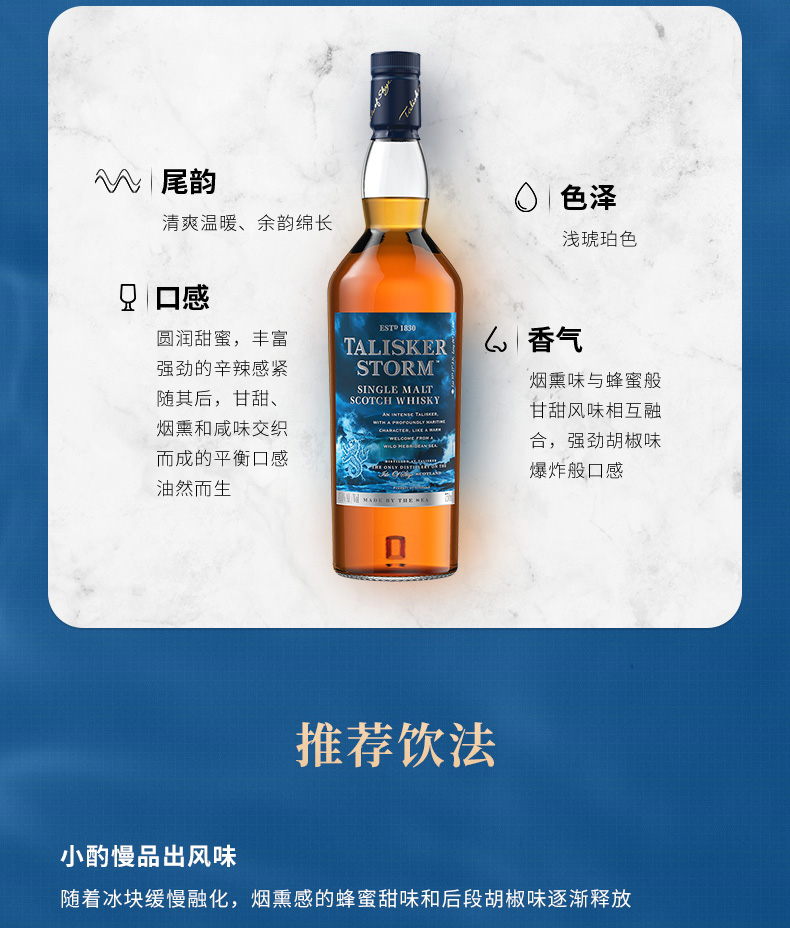 口感:烟熏,奶油冰激凌般的甜,胡椒,水果,意思不易察觉的泥煤以及海水拍打海岸的味道,甜美又不失强烈,具有浓郁的干燥水果香甜、浓密的烟熏及强烈的大麦麦芽风味,口感温和而滋味鲜明,尤其在口腔后部还会迸发出强烈的胡椒风味。