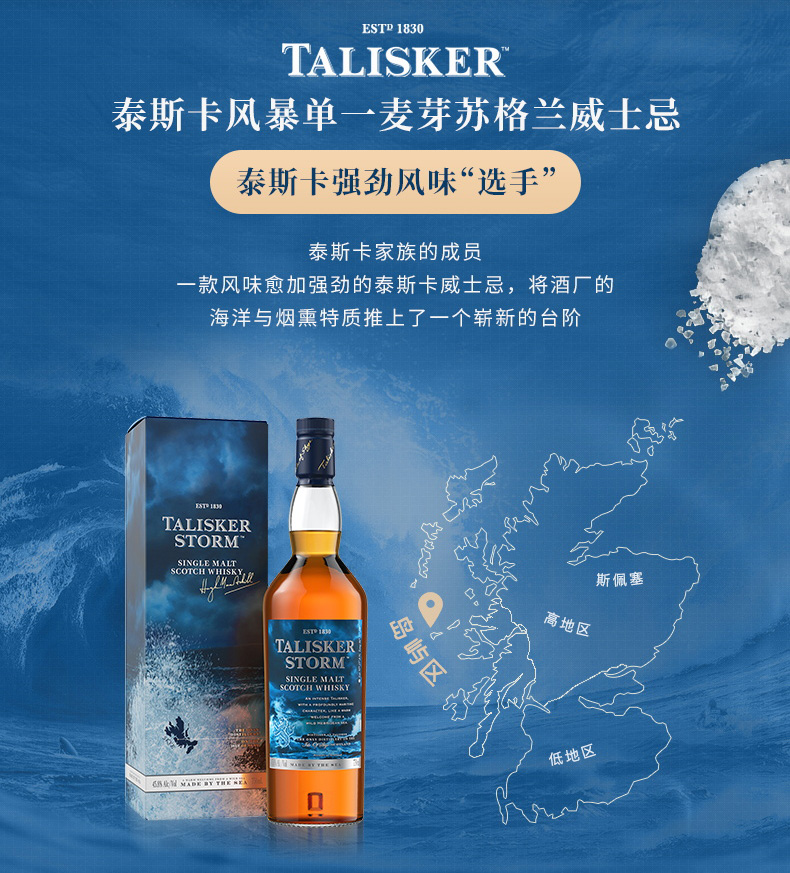 泰斯卡由1830年由麦卡斯吉尔兄弟建立于哈柏湾旁,它的名字来自于挪威语中的「ThalasGair」,也就是倾斜的岩石的意思。斯虽然地处偏远,但高质量的威士忌产品让泰斯卡蒸馏厂屹立不摇,一直到1982年止,都是使用岛屿威士忌中很少见的三次蒸馏法,就算是现在,也是很努力的制造一种完全独立风格的威士忌,原始、烟熏、海洋,连小说家罗伯特.刘易斯.史帝文森都说它是「酒中之王」。