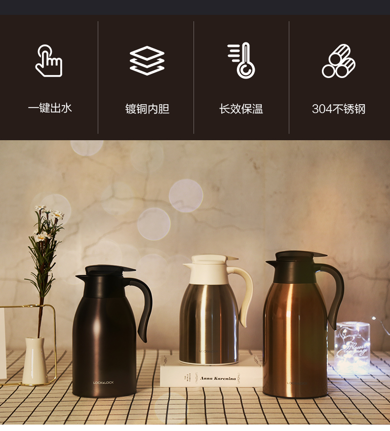 天猫乐扣乐扣旗舰店159元,可领80元优惠券,实付79元到手。这款LOCK&LOCK 乐扣乐扣 妙趣咖啡壶,规格:1.5L,一键式按压出水,验收操作,方便倒水。304不锈钢材质,内胆外壁铜渡处理,可维持6小时保温。
