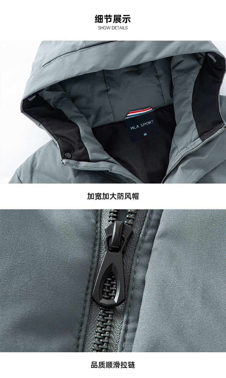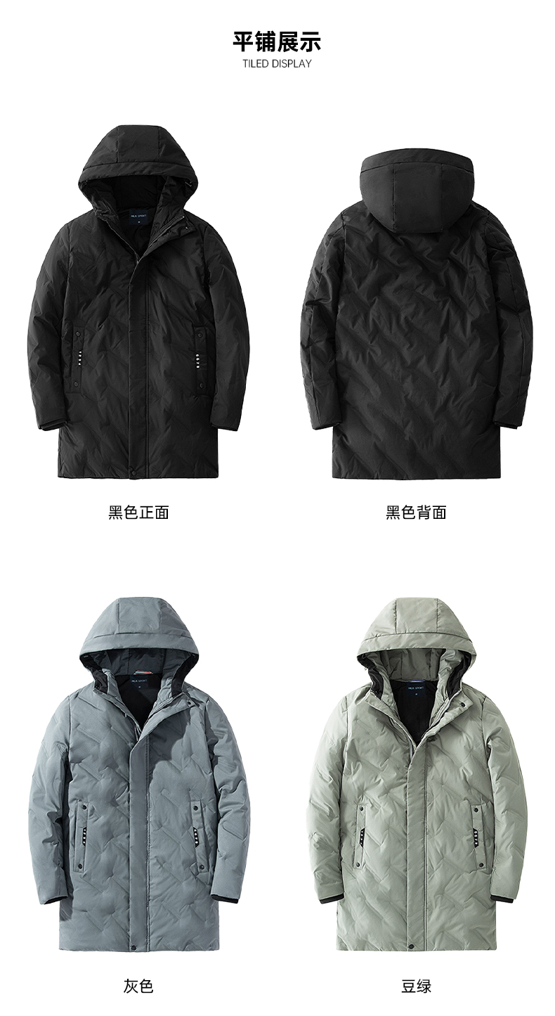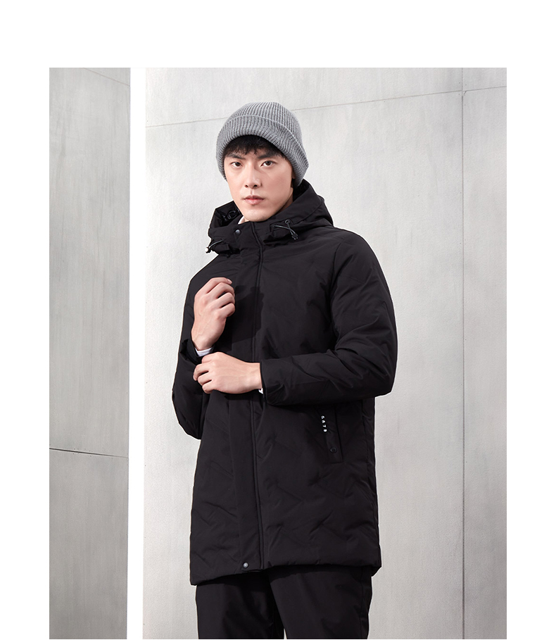 在款式上,中长款设计,下摆过臀,一体连帽、加宽加大的防风帽搭配半高衣领,能有效阻止寒风的倒灌;内置双层针织弹力防风袖口,双重门襟,有效保暖;两侧口袋有拉链,置物安全。