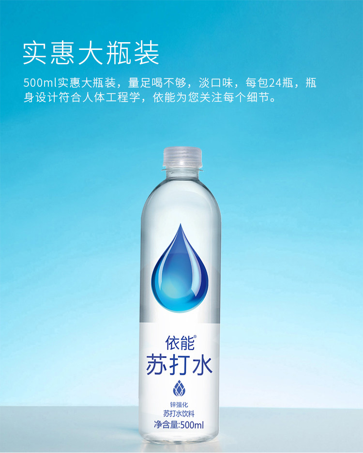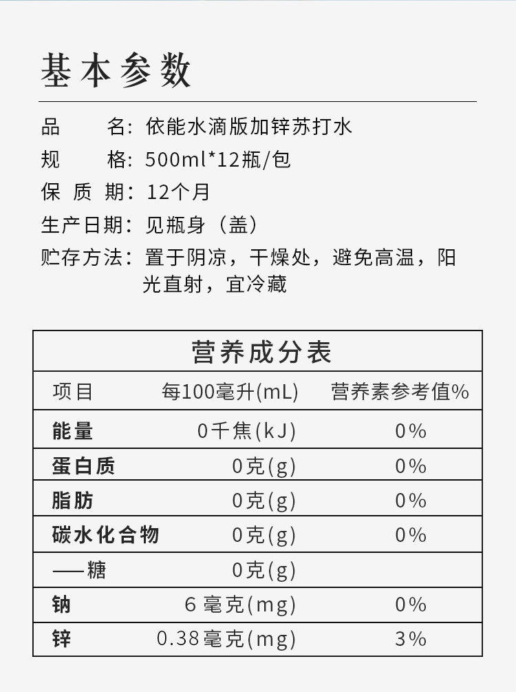 依能苏打水,0糖0脂0卡路里,对身体没有影响,口感清甜圆润,大人小孩均可饮用,水的PH值呈弱碱性水,富含多种微量矿物元素,经常饮用可以补充人体所需。冰镇后口感更佳。