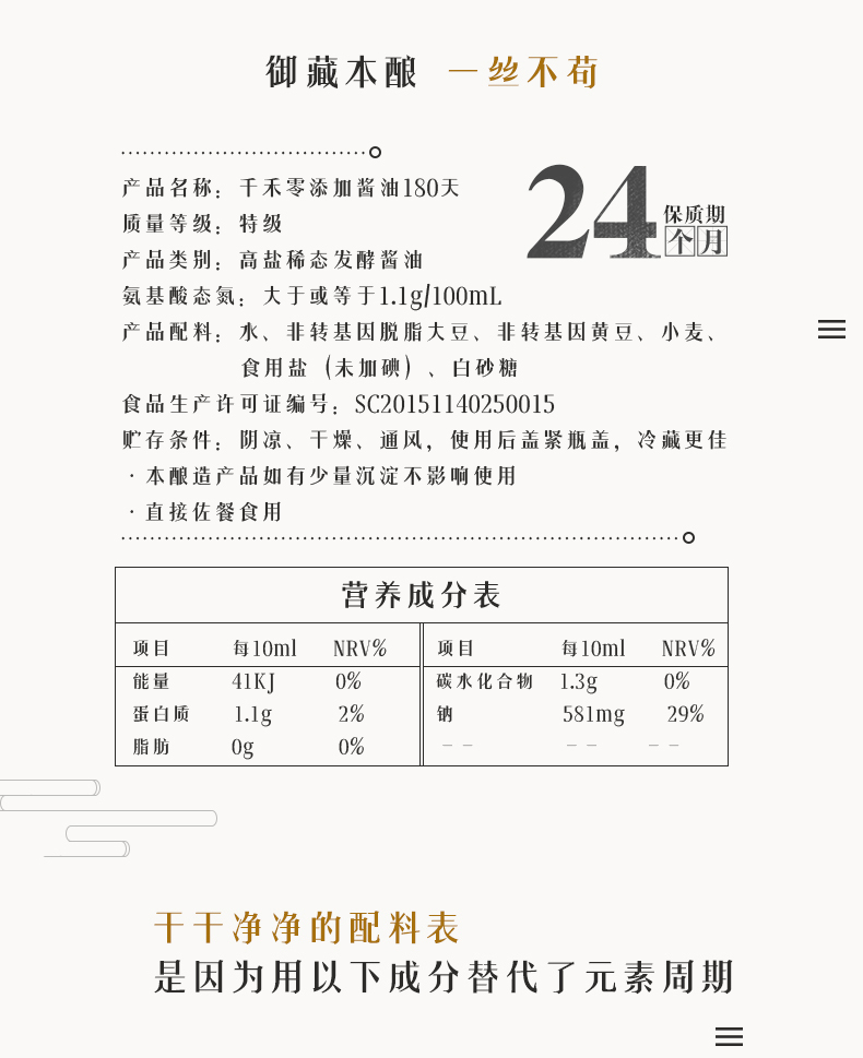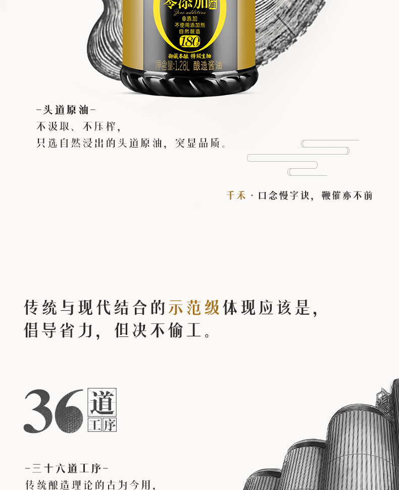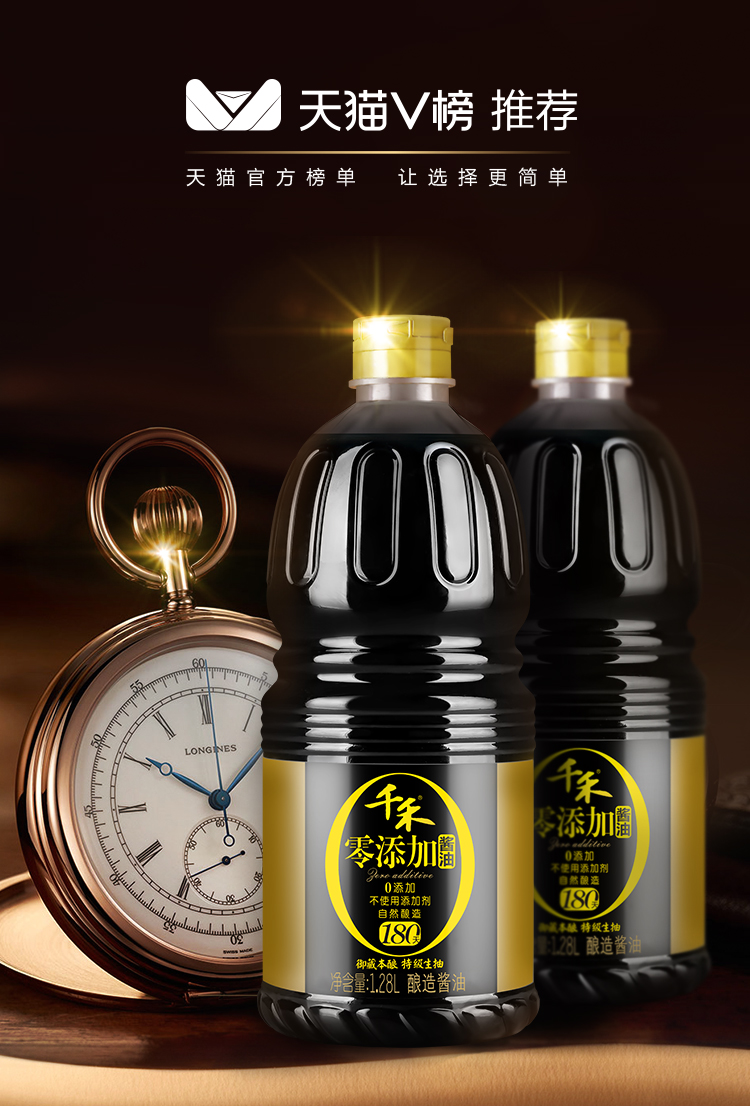 天猫V榜推荐,千禾 180天酿造 零添加酱油,就是原来的千禾头道原香特级生抽,采用黑龙江非转基因脱脂大豆,水源来自岷山雪域高原之水,38道工序,180天发酵,封罐秘制,氨基酸态氮含量1.1,不添加任何人工添加剂,口感醇厚,香味浓郁。