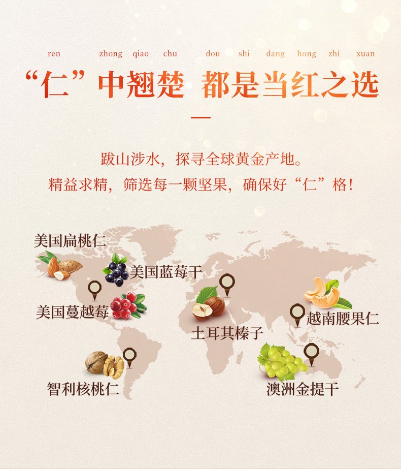 中国每日坚果标杆品牌,坚果行家倾力推荐,超高性价比,甄选全球原产地优质坚果水果,新鲜采摘立即放入0℃保鲜库,经层层筛选,轻加工原味烘焙,味道自然纯正,无添加,果肉肥厚,香甜味美,大人小孩都爱吃~