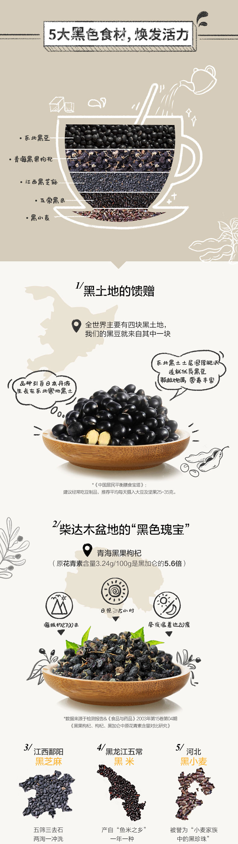 这款五谷磨房 黑之养五黑豆浆粉,配方均衡,含4大营养素,铁、锌大豆异黄酮和膳食纤维,精选5大黑色食材:生长在鄱阳湖平原的黑芝麻,钙含量约为牛奶的7.3倍;东北黑大豆,圆润饱满,低温烘焙,蛋白质含量≈6个鸡蛋;黑龙江五常黑米,含多种矿物质;柴达木盆地青海黑果枸杞,原花青素含量3.24g/100g,是黑加仑的5.6倍;还有黑龙江五常的黑米、河北珍稀黑小麦,采用科学比例搭配,精细研磨而成,爱自己,喝五谷,营养与美味共存。