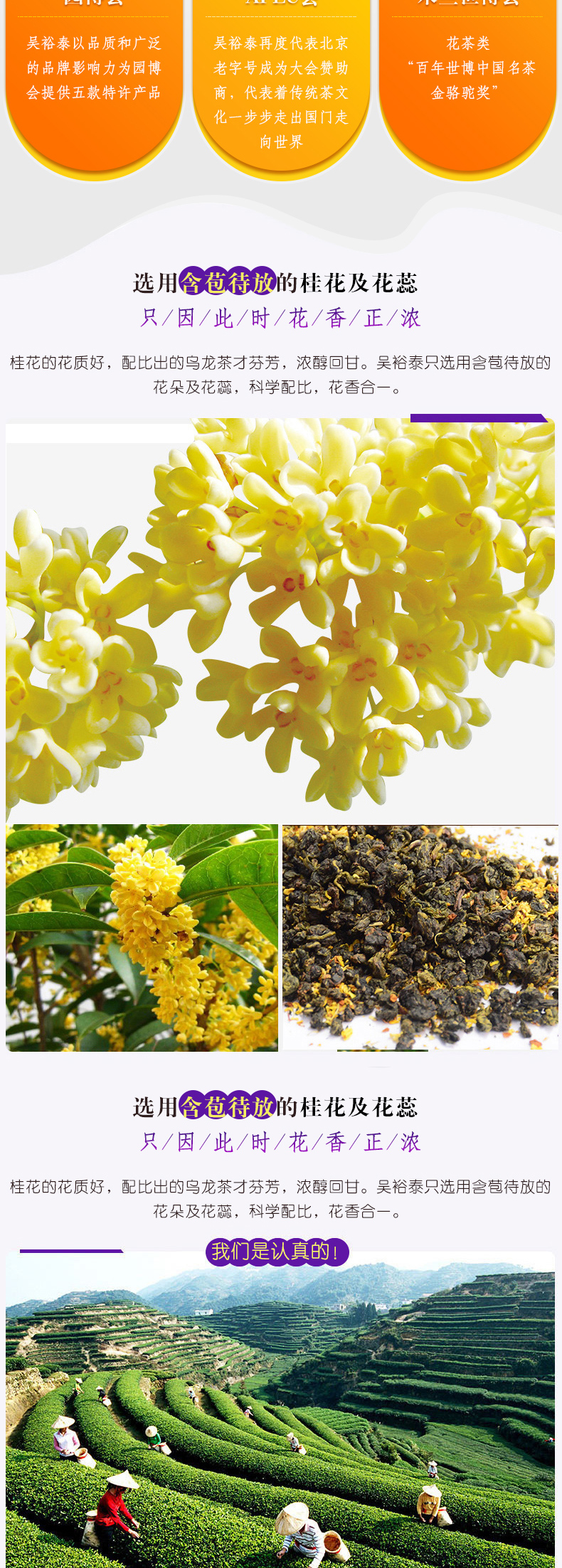 这款吴裕泰 2021新茶 特种桂花乌龙茶,规格: 60g,选用含苞待放的桂花花朵和花蕊,常年受云雾滋养的高山乌龙茶为原料,经加热、团揉、包揉、复焙等多道工序,科学配比,吴裕泰传承百年的窖制工艺加持,制成这款花香四溢,浓醇回甘的好茶。乌龙紧结,桂花均匀,冲泡出的汤色清澈明亮,花香四溢,韵味悠长。