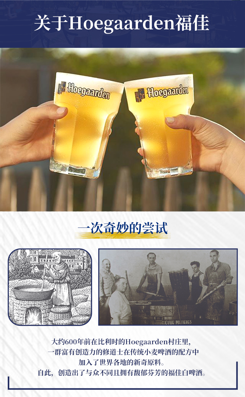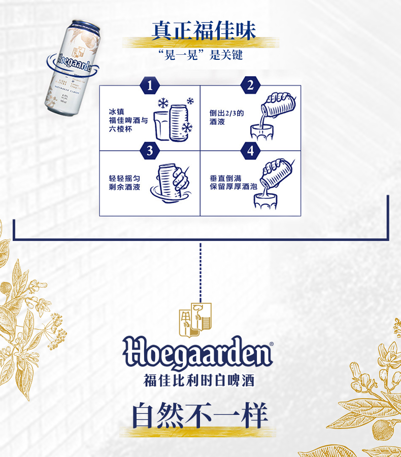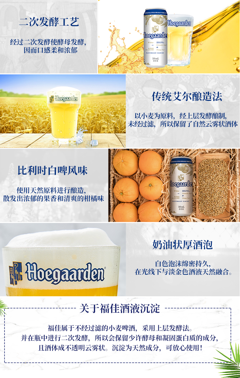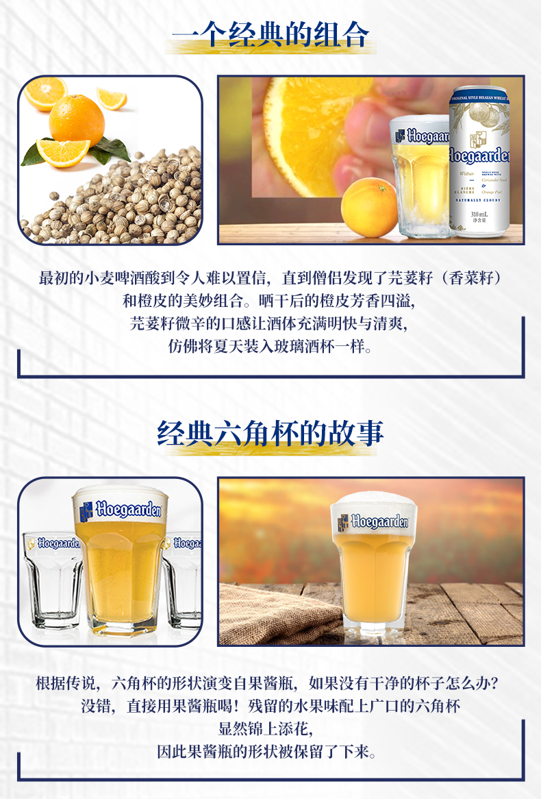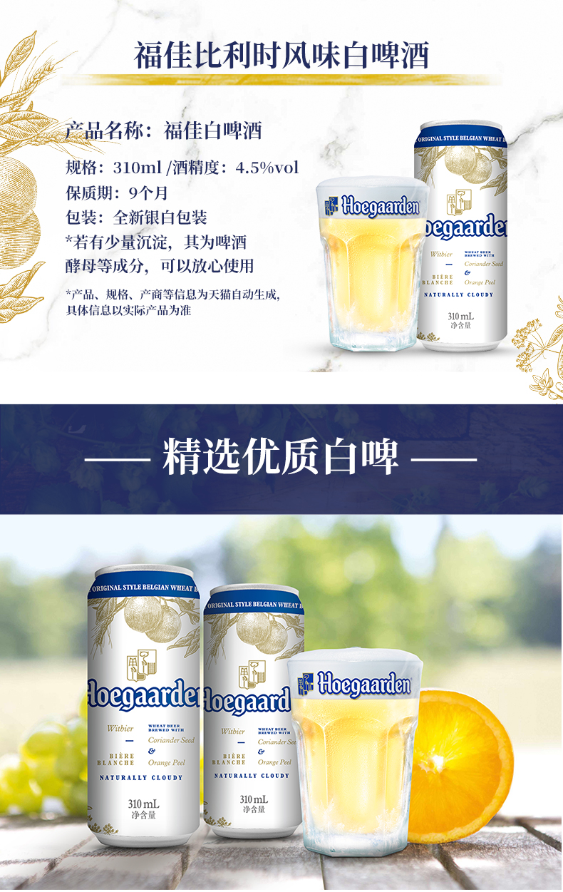 这款比利时Hoegaarden福佳精酿白啤酒,荣获2016年啤酒世界杯麦啤品金奖,也是比利时的国宝啤酒,芫荽籽和橙皮的组合,晒干后的橙皮芳香四溢,芫荽籽微辛的口感,让酒体充满明快与清爽。酒精度:4.9%VOL,全新银白包装。