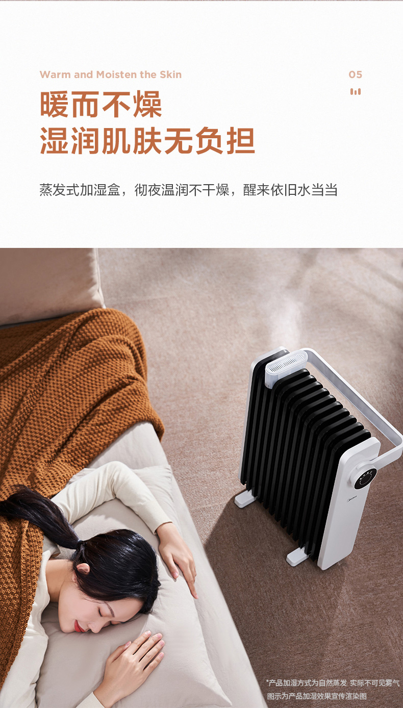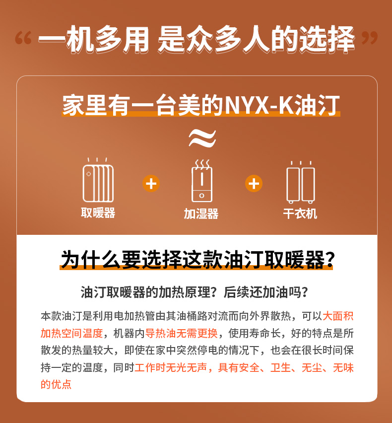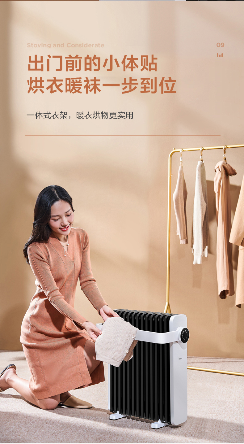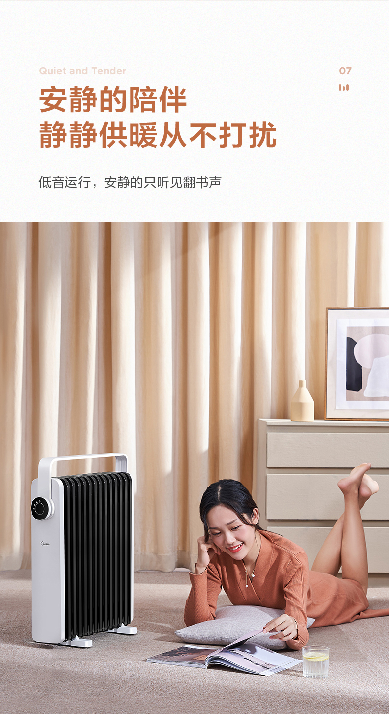 这款美的电热油汀取暖器,166mm加宽油汀片,13片油汀同时升温,创新鱼骨油路速热设计,配合烟囱散热风道,散热面积更大,提高了热效率,制热速度更快,使用寿命更长。