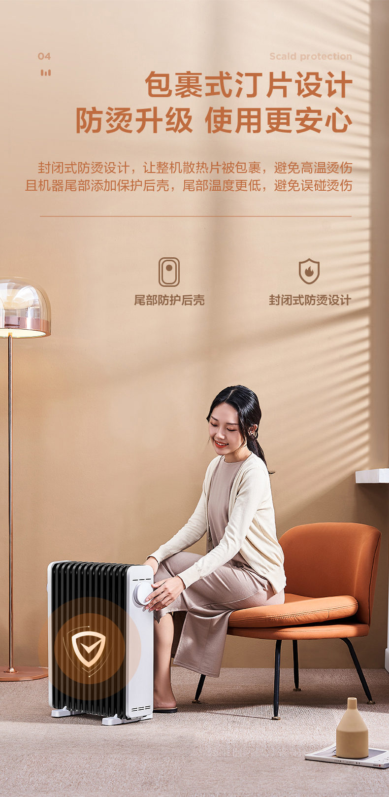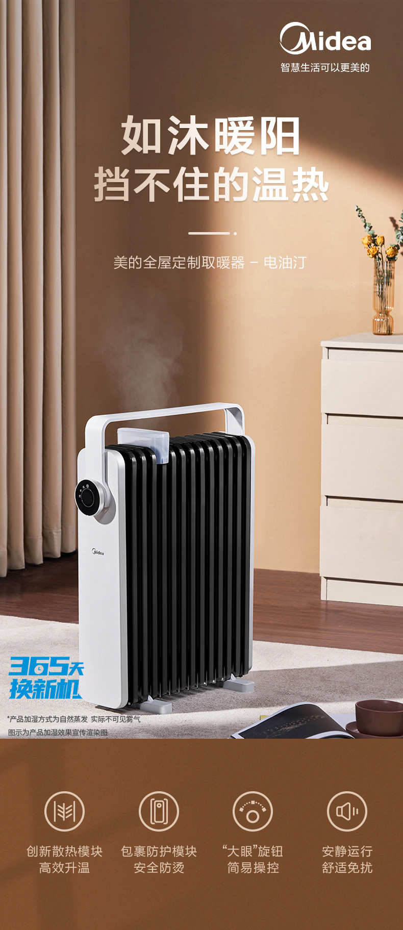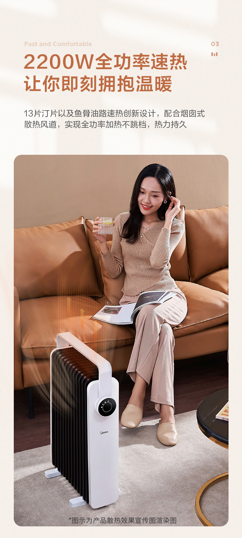 这款美的电热油汀取暖器,166mm加宽油汀片,13片油汀同时升温,创新鱼骨油路速热设计,配合烟囱散热风道,散热面积更大,提高了热效率,制热速度更快,使用寿命更长。