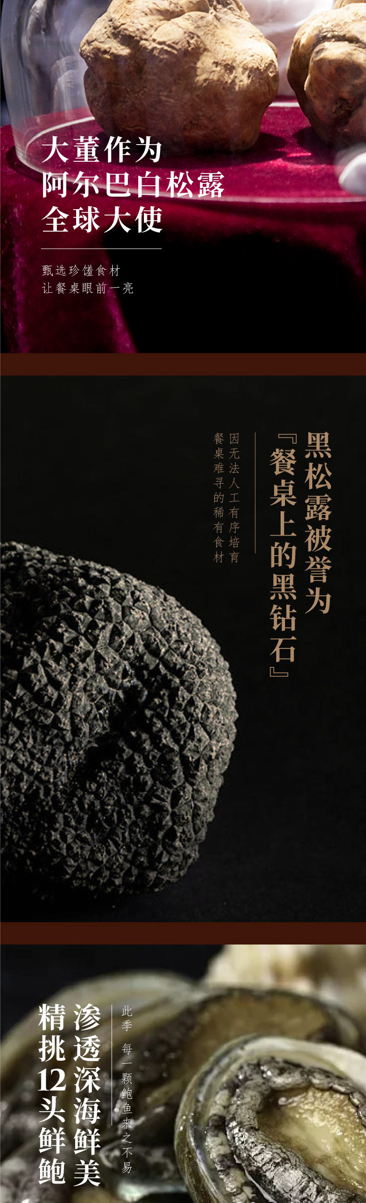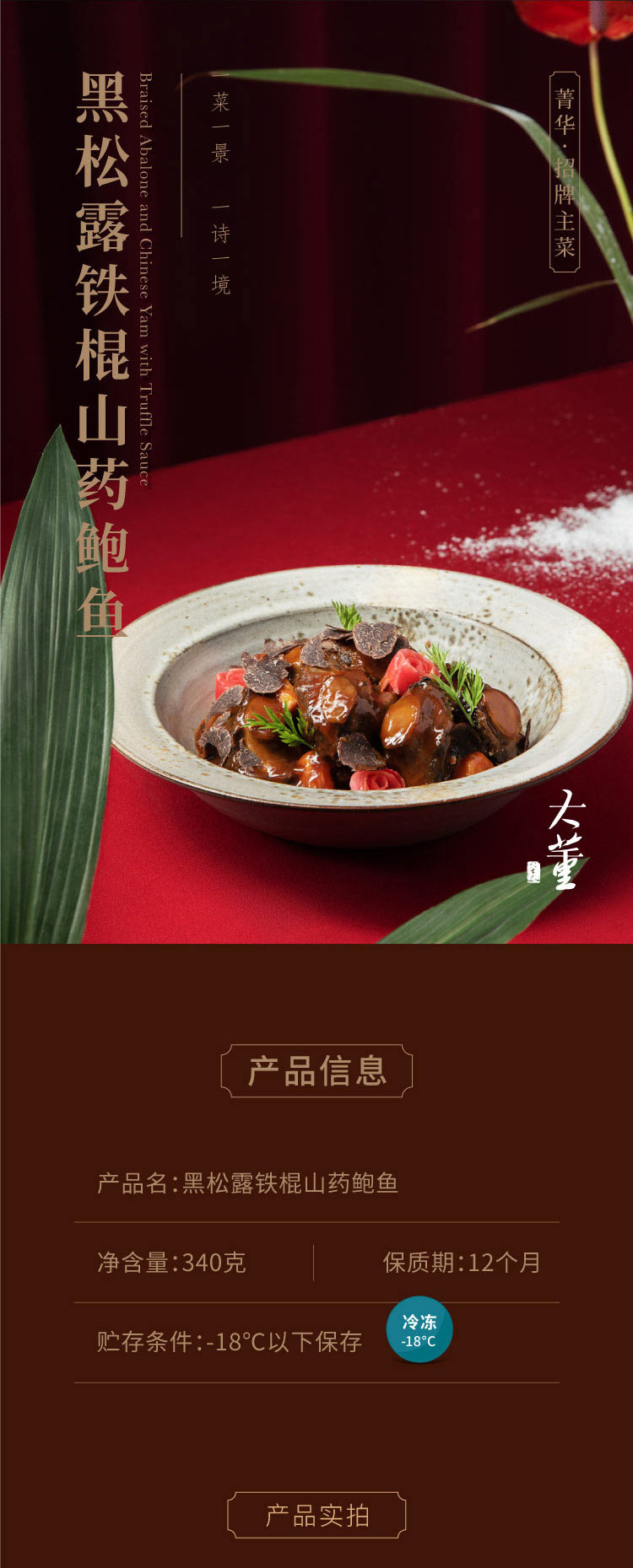 这款黑松露铁棍山药鲍鱼是大董的创意招牌菜之一,优选阿尔巴黑松露,精挑细选12头鲜鲍鱼,以及正宗的铁棍山药。一浸、鲍鱼鲜味嫩而香,肉质紧实富有较近;二焗、激发黑松露的幽香;三煨、文火焖炖数小时,三者交融入味透彻,是一款高端创意菜。