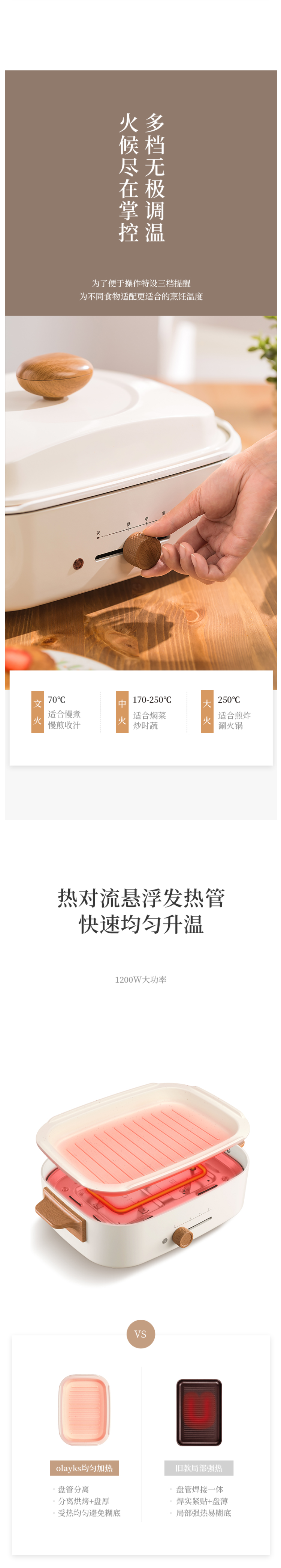 功率是1200W,多档无极控温,70℃/小火-适合慢煮慢煎收汁;170~250℃/中火-适合焖菜炒时蔬;250℃/大火-适合煎炸涮火锅。
