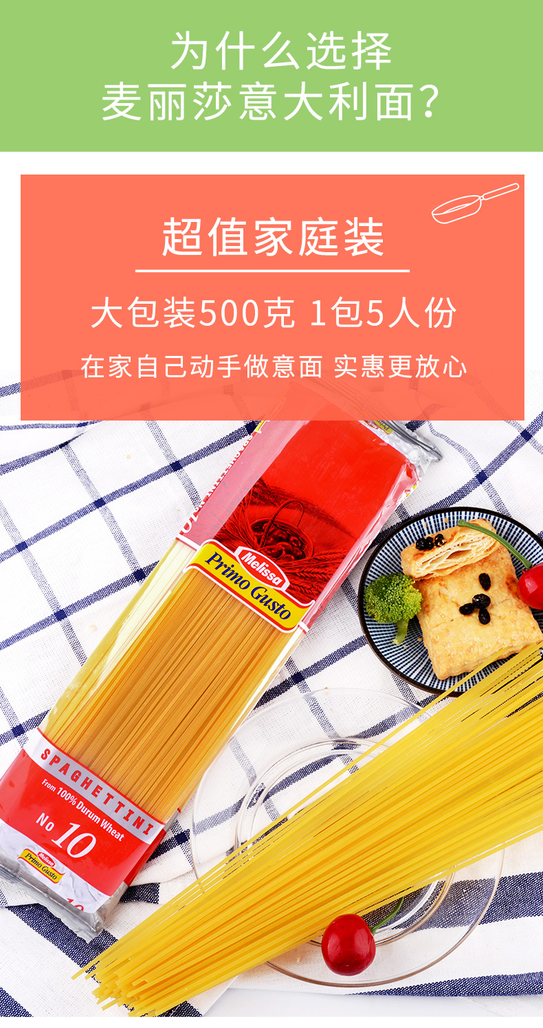 这款意面,希腊原装进口,以杜兰小麦为原料,这个品种属于硬质小麦,具有高密度、高蛋白质、高筋度等特点,做成的意大利面呈金黄色,耐煮、面质软弹,口感劲道爽滑,其中每100g含蛋白质12g、脂肪1.5g、不仅可以满足人们所需营养,还可以增加长时间的饱腹感;采用低温烘干健康无添加,适合所有人群食用。