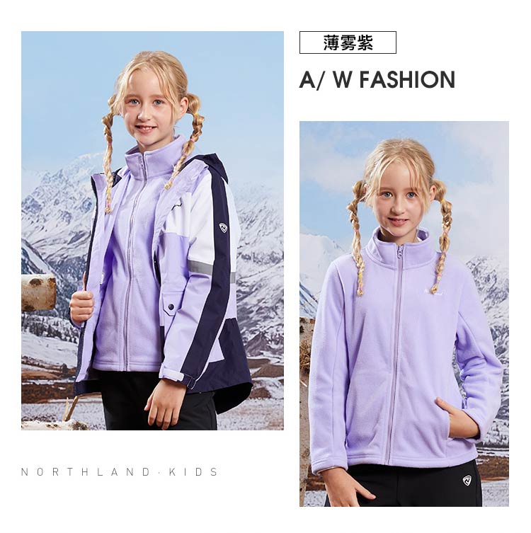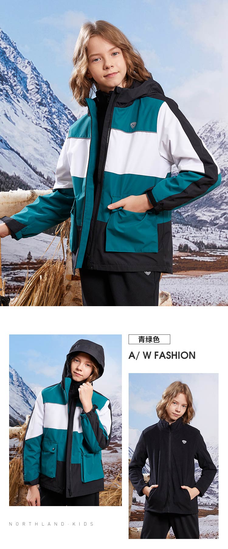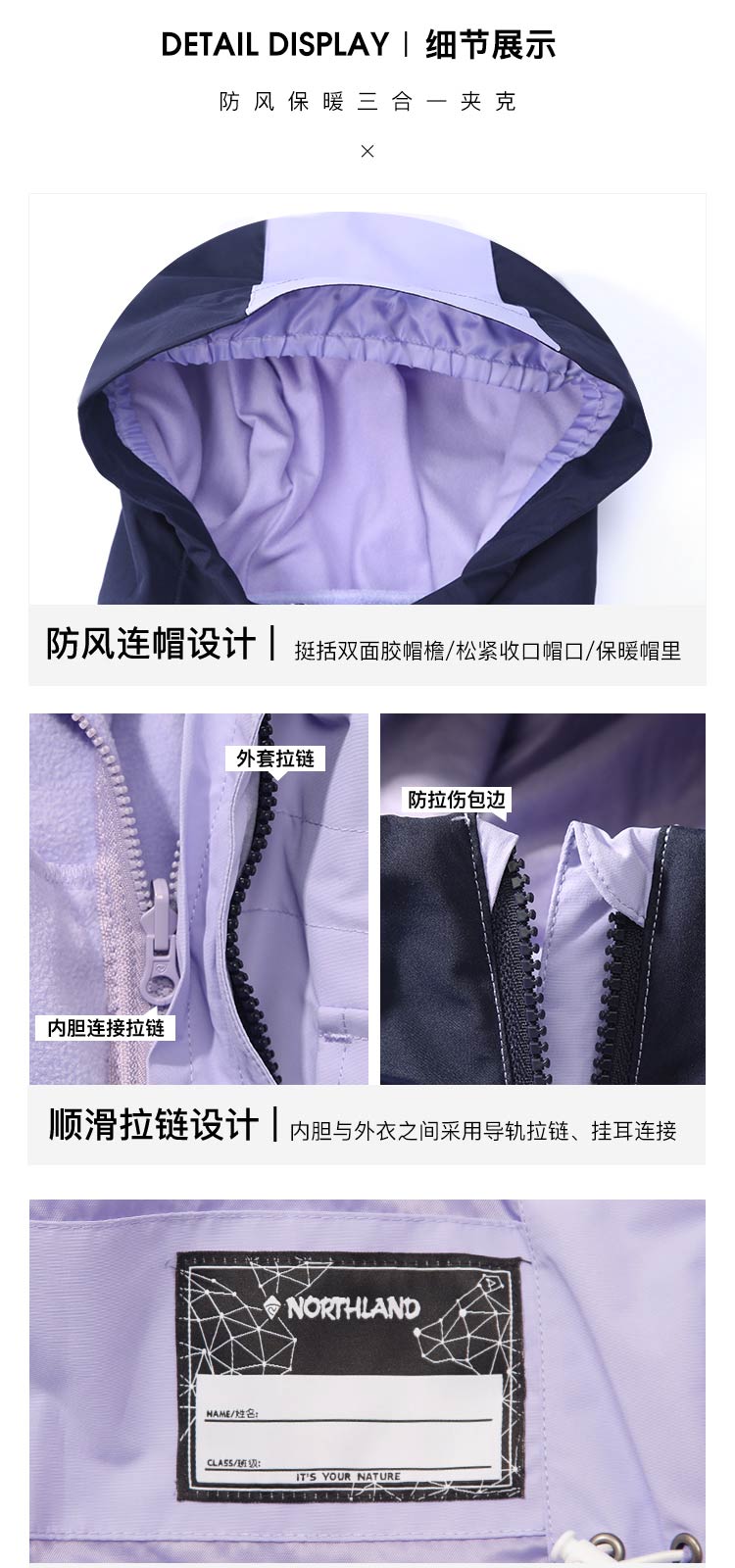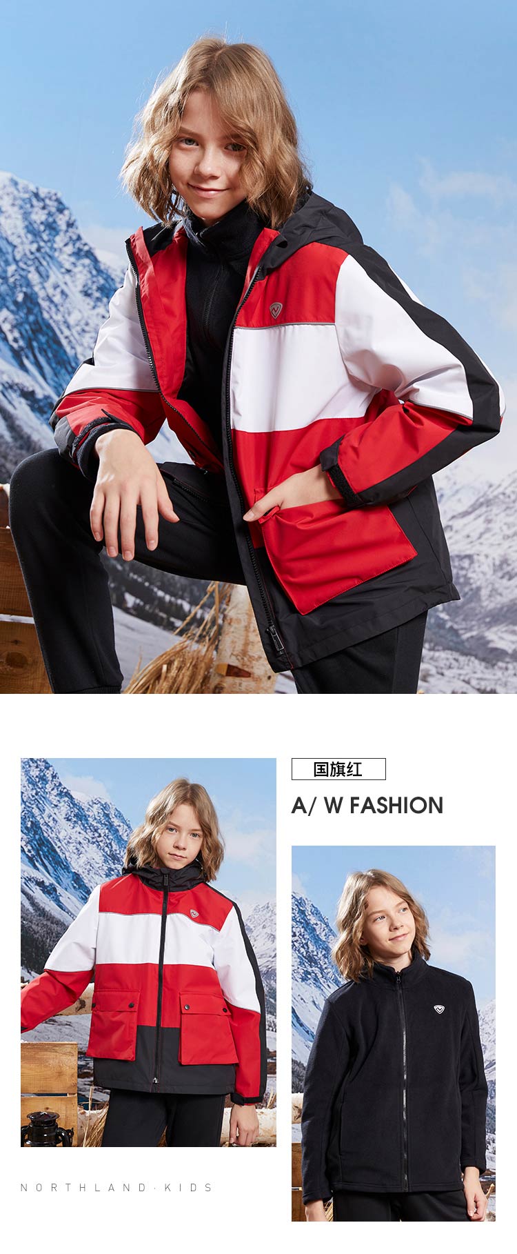 这款Northland 诺诗兰 儿童三合一冲锋衣,选用特殊面料,专业防水科技,具有良好的防水性能和透气性能,阻挡雨水的同时,排出身体周围水汽,保障长时间运动干爽舒适;升级250g摇粒绒内胆,加倍保暖畜热,袖子内里采用尼丝纺,顺滑易穿脱。防风连帽,帽檐采用双面胶工艺,帽口松紧收口.可拆卸设计,一衣三穿,应对环境多样穿着。