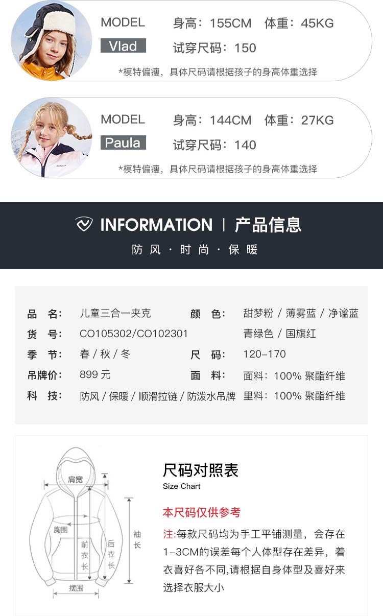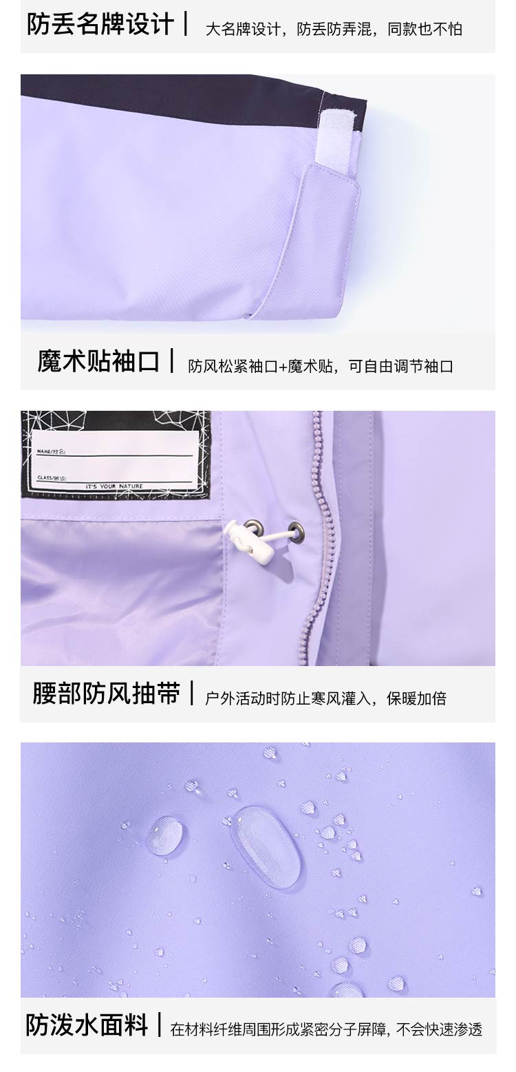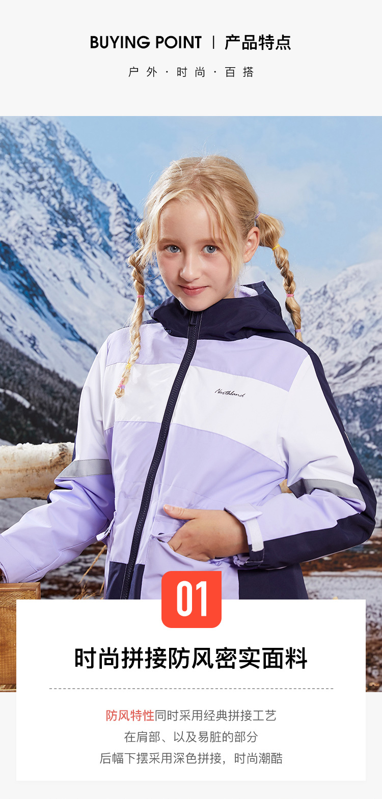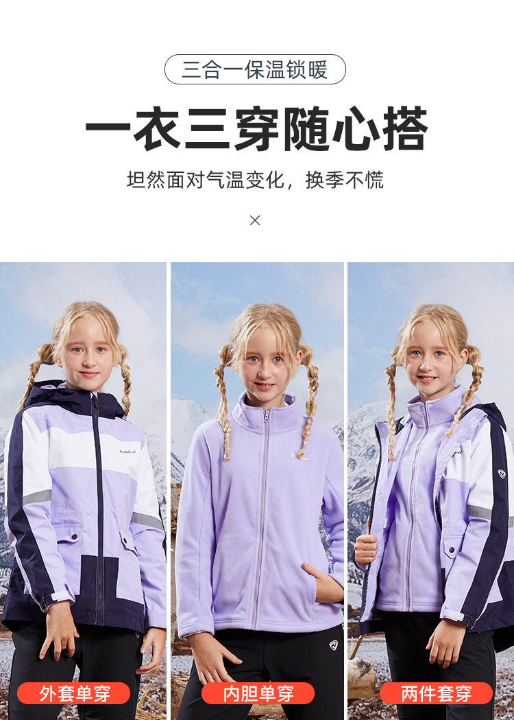 这款Northland 诺诗兰 儿童三合一冲锋衣,选用特殊面料,专业防水科技,具有良好的防水性能和透气性能,阻挡雨水的同时,排出身体周围水汽,保障长时间运动干爽舒适;升级250g摇粒绒内胆,加倍保暖畜热,袖子内里采用尼丝纺,顺滑易穿脱。防风连帽,帽檐采用双面胶工艺,帽口松紧收口.可拆卸设计,一衣三穿,应对环境多样穿着。