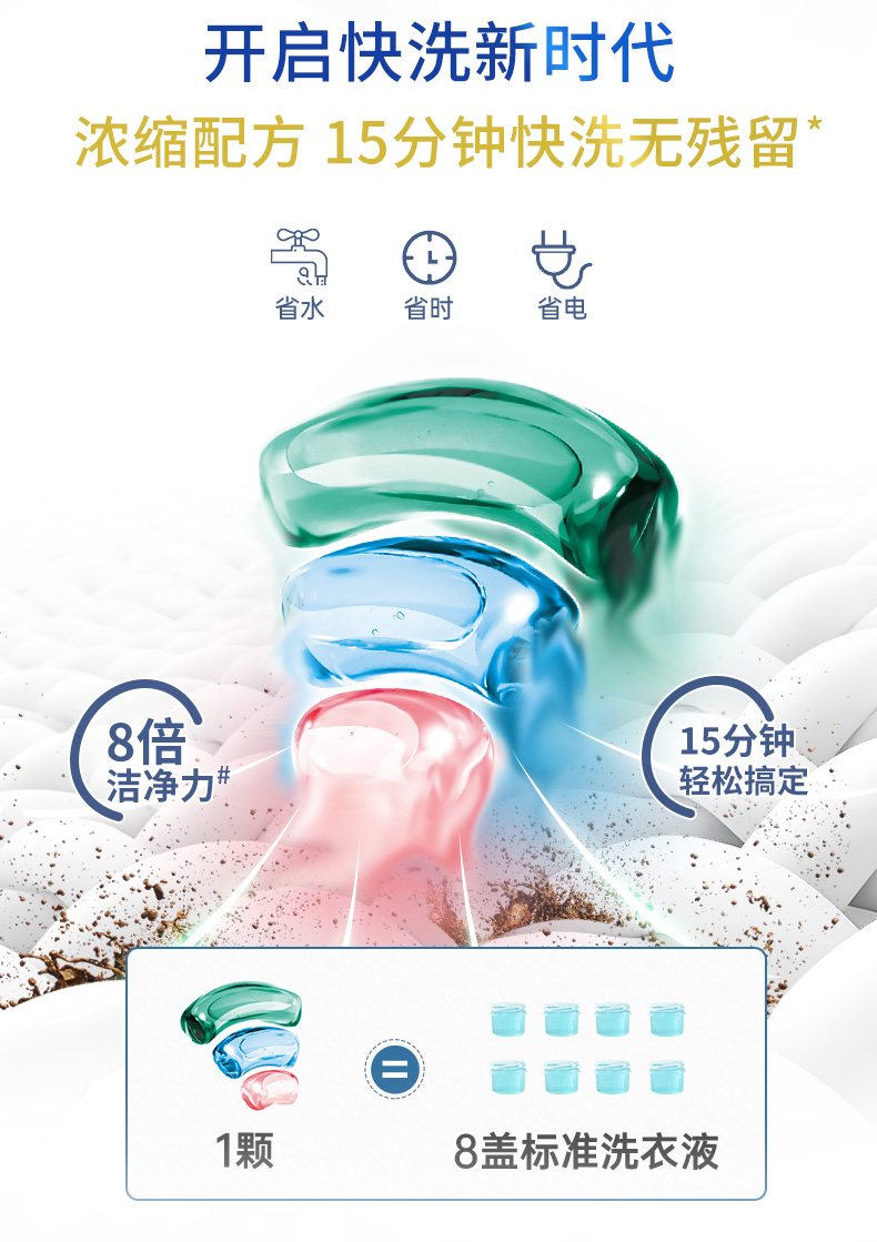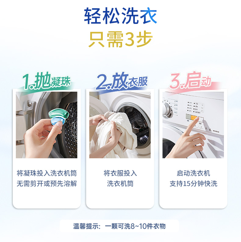 洗衣凝珠,本质上是独立小包装的浓缩洗衣液,像胶囊一样裹着外膜,这个外膜可承受15kg压力,平常运输不会破,但遇水后1-3分钟会融化,洗涤效果和洗衣液差不多。洗衣凝珠最大的优点是不脏手,免去了倾倒滴漏的烦恼。