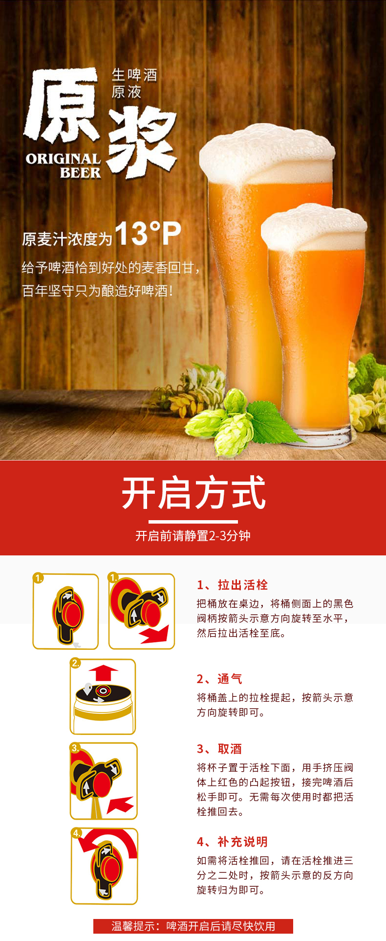 酒液浑浊粘稠,泡沫丰富,细腻如牛奶,绵绵持久,不添加CO2,喝了不涨肚。原麦汁浓度 13°P、酒精度≥4.7%VOL。未经过滤保留了对人体有益的活性酵素,喝完也不头疼。