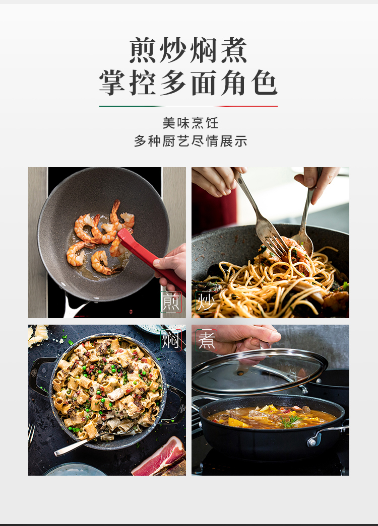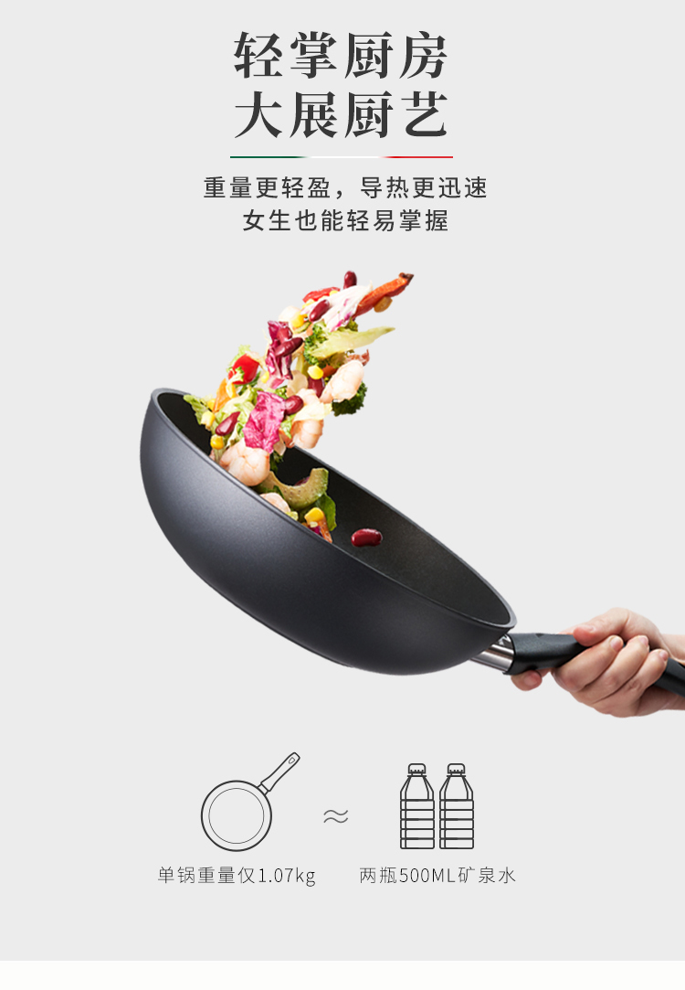 雷雅托系列28cm平底炒锅,98%高纯度铝材质,锅身一体冷锻铸造无铆钉,锅身轻盈耐腐蚀,环保生产不含有毒化学物质,使用健康有保障。9.6cm深渊锅型,满足煎、炸、炖、煮多种需求,Thermopoint红绿感温点专利技术,通过红绿颜色变化更精准控温度;Keravis Ti-X镀层,食品级不沾、方便易清洁,百洁布水磨测试1.65万次,镀层表面无脱落。