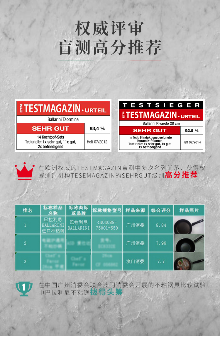 巴拉利尼起源于1889年的意大利,目前是双立人旗下品牌,所有的锅具均坚持只在意大利制造,12年曾获得testmagazin(国际知名的一家测评网站,月费10欧元)的最推荐锅具品牌。