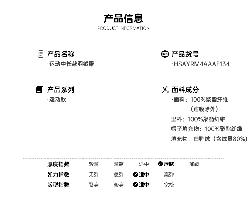 这款海澜之家男中长款连帽羽绒服,是2021的秋冬新款,外层使用的是100%聚酯面料,耐磨抗皱易打理,内里填充的是80%的白鸭绒,充绒量在89~120g左右,属于中等厚度,能抗0至-10℃。