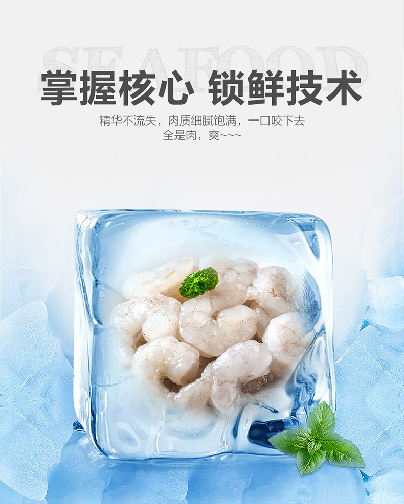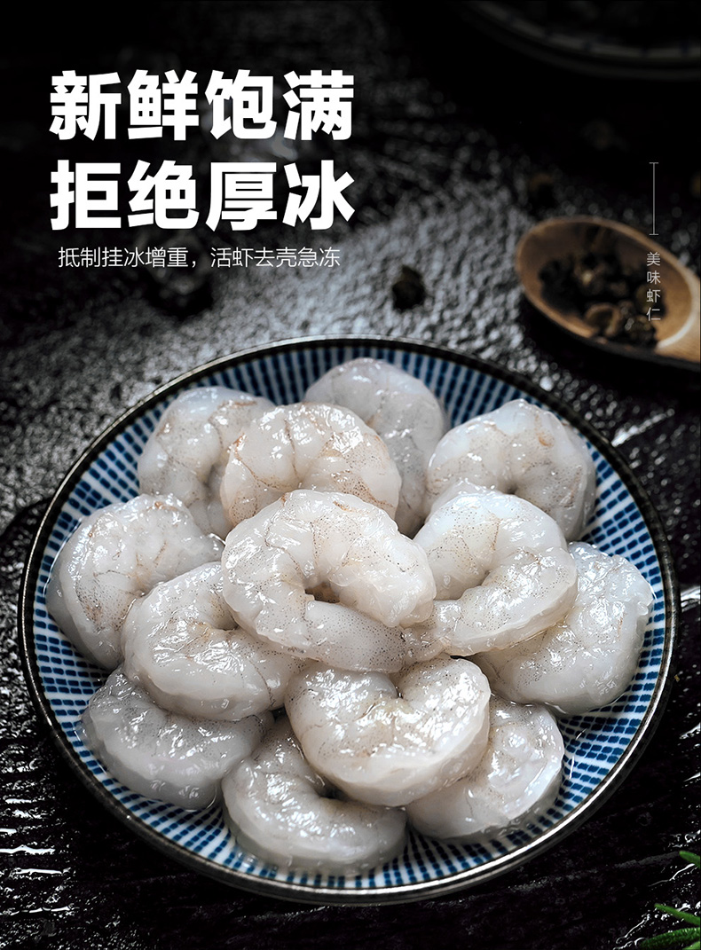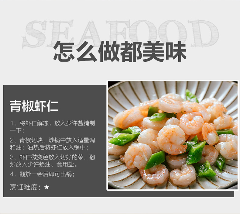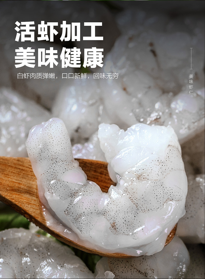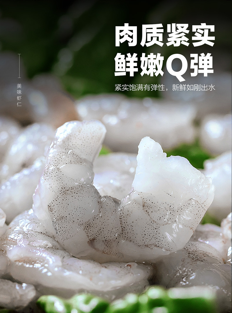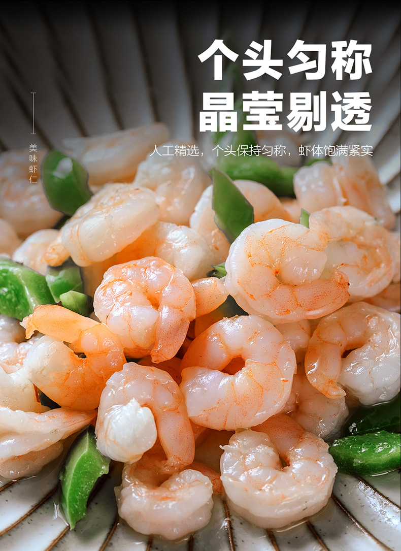 天然野生海捕大虾,鲜活加工,去壳去肠急冻,锁住新鲜,虾仁肉质紧实Q弹,有嚼劲,煮后不缩水,可烧、煎、炸、也可白灼或包馅,营养又美味。