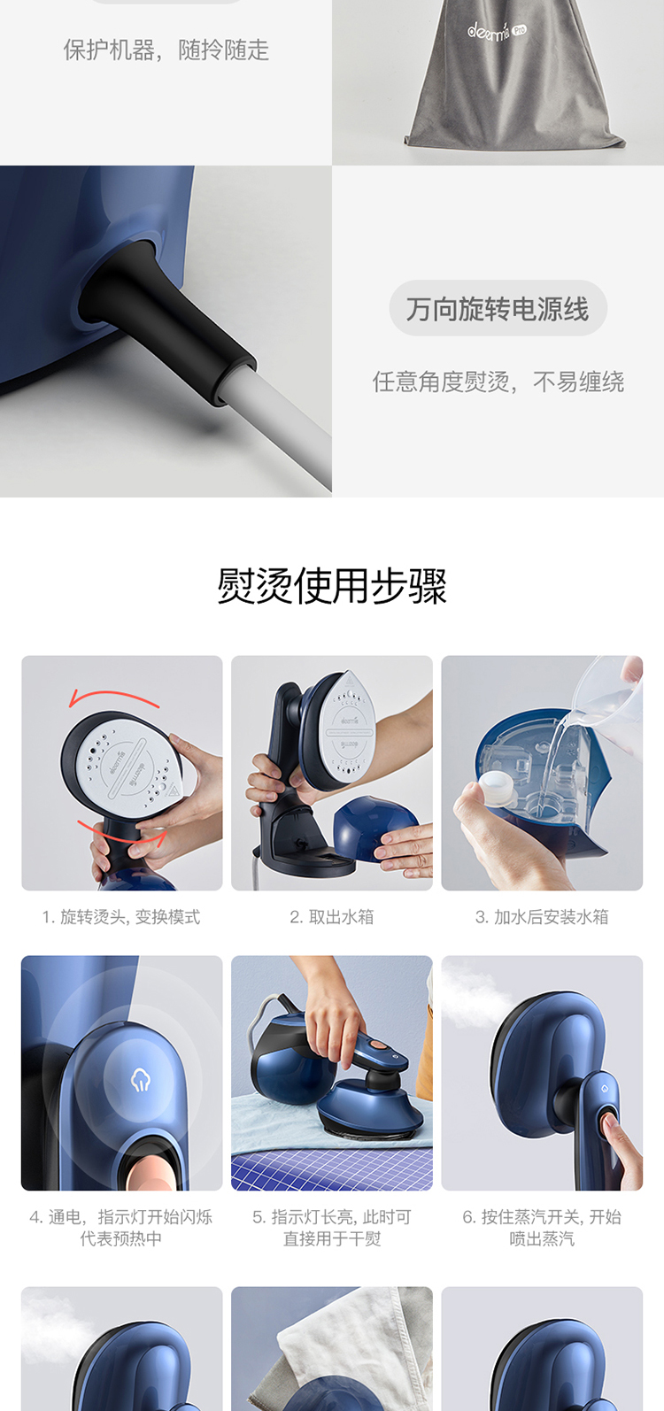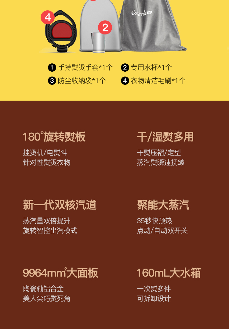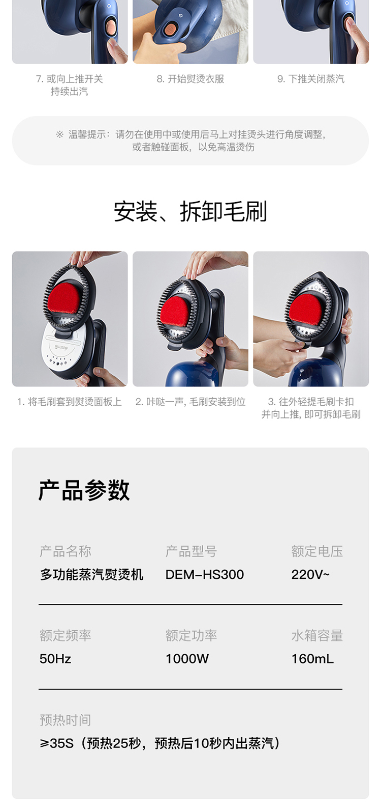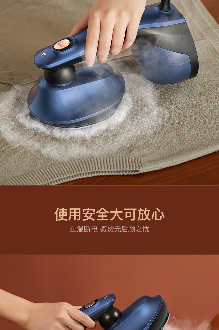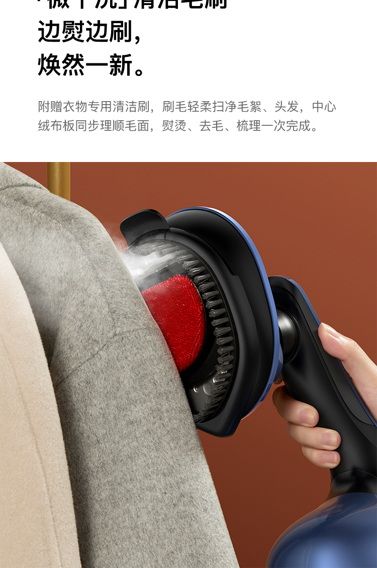 细节上:水箱即底座,免支架随时放置,对毛料衣物可边熨边刷,熨烫。梳理一次完成,万向旋转电源线,任意角度不易缠绕,配有清洁刷,精准控温器,过温断电保护,降低安全隐患,使用更安全。
