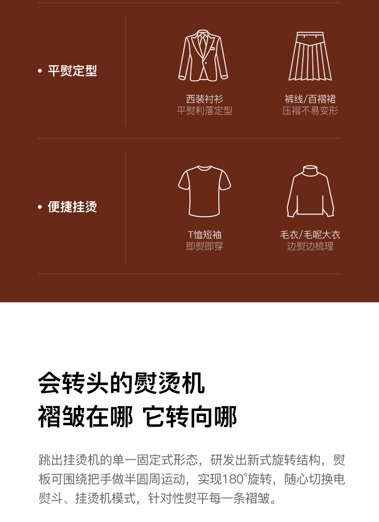 升级无边熨烫大面板,采用3mm厚纳米陶瓷釉铝合金材质,顺滑熨烫不伤衣,面板新式可旋转结构,实现180°旋转,随心切换电熨斗、挂烫机模式;巧设美人尖,即使衣领、纽扣、边角等细小褶皱也可轻松熨平。160ml可拆卸大水箱,满水续航约9分钟,一次可满足多件衣服使用需求。