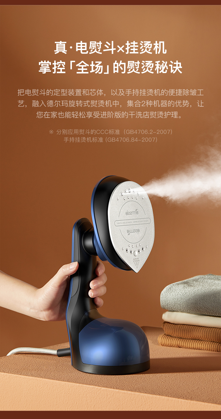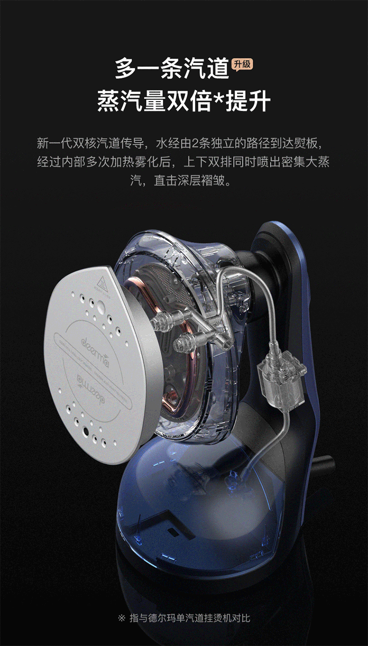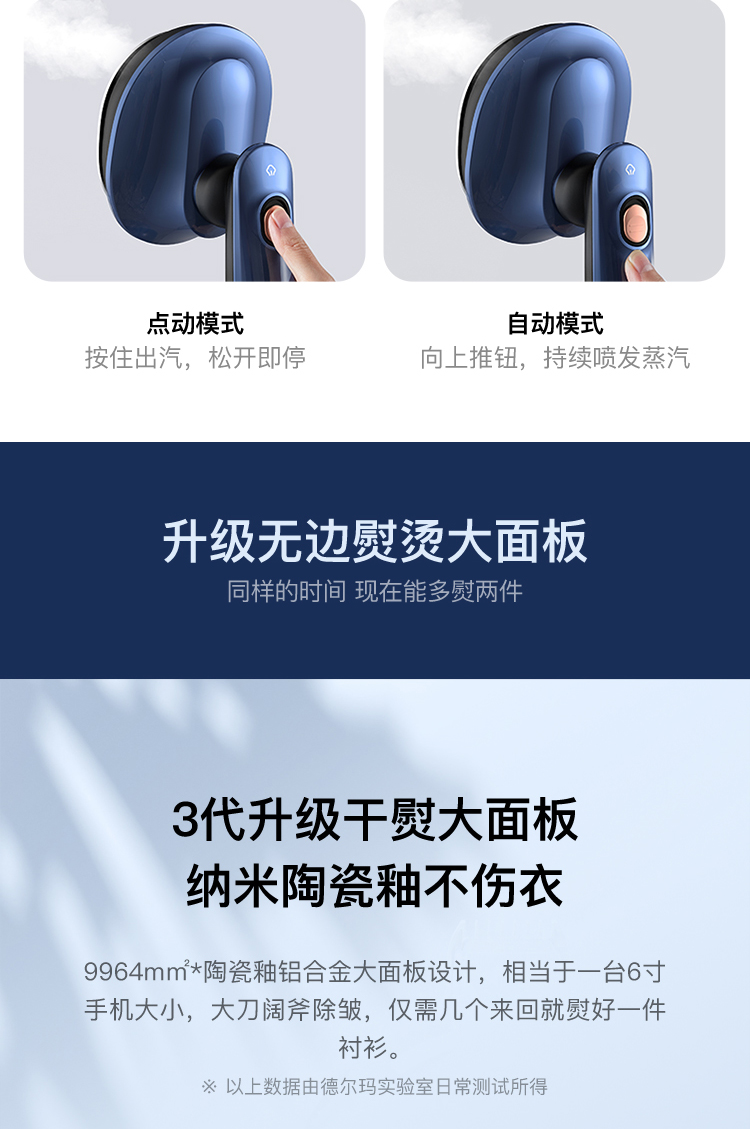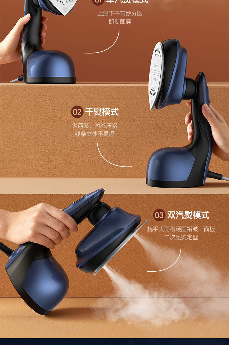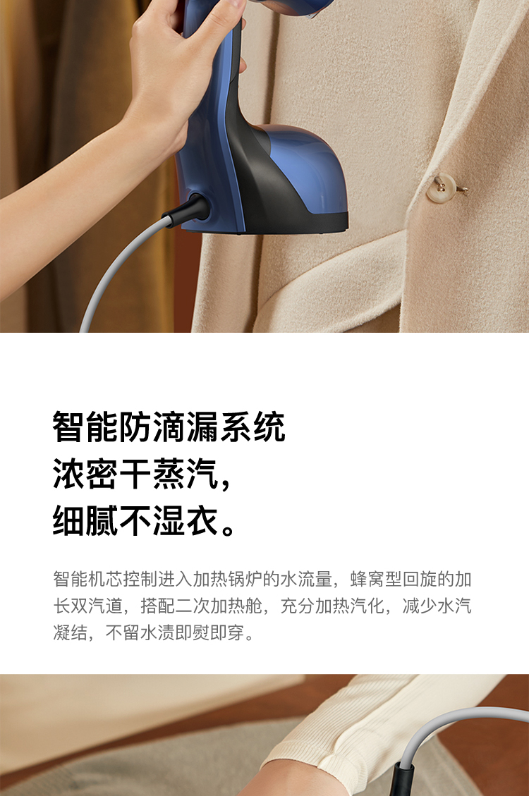 这款手持挂烫机,干熨+单汽熨+双汽熨三种模式可选,即能平熨压烫出笔挺衣型,又具备手持挂烫机的轻巧便携,采用新一代双核汽道传导,水经由2条独立的路径到达熨板,经过内部多次加热雾化后,上 下双排同时喷出密集大蒸汽,直击深层褶皱,智能防滴系统,智控进入水量、充分加热汽化,不留水渍,即熨即穿,方便快捷。