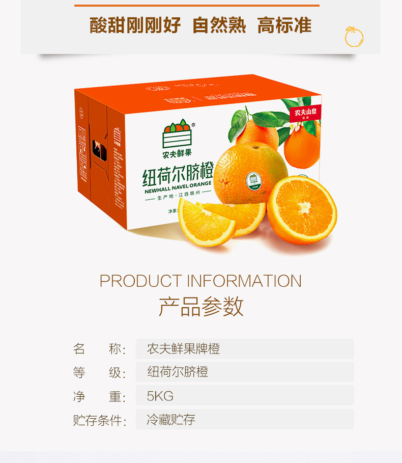 农夫山泉纽荷尔脐橙,是以美国农业部USDA的分级标准为验收标准,橙汁多饱满,皮薄、个大、肉质饱满、水分充足、果渣少,富含柠檬酸、苹果酸、琥珀酸等多种果酸,对人体健康有益,这款水果也非常受欢迎。规格:5kg。