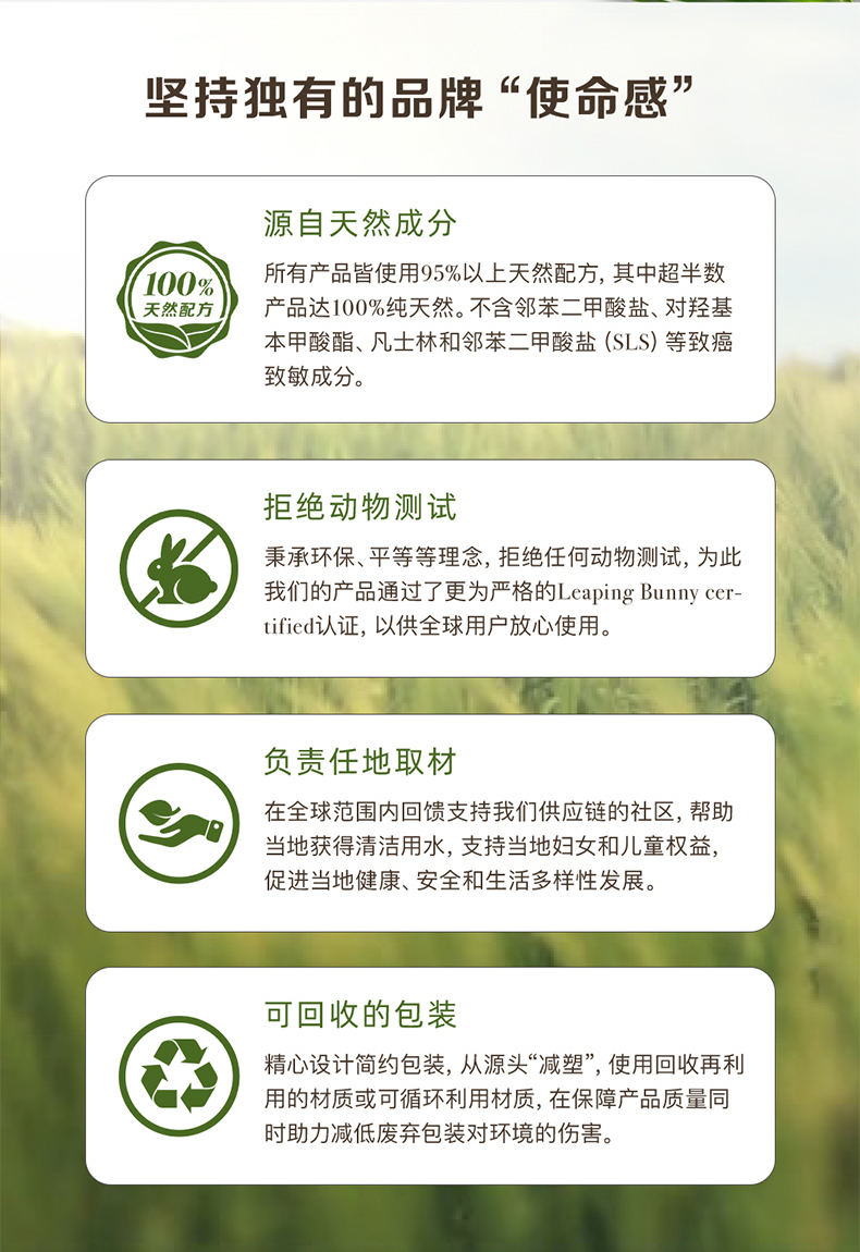 产品拥有超过3万个零售点,包括美国、英国、爱尔兰、加拿大、澳洲、徳国、台北、香港、曰本及韩国的百货专柜、有机商店与药妆商店,天然环保的形象,受到消费大众的广大回应。