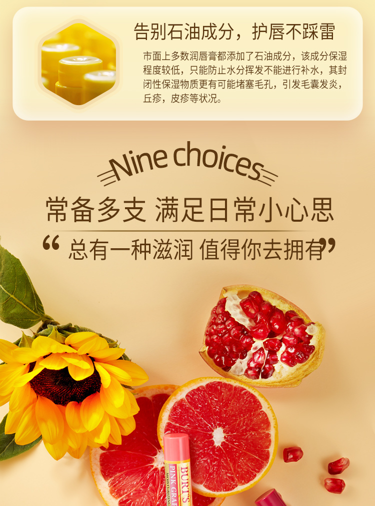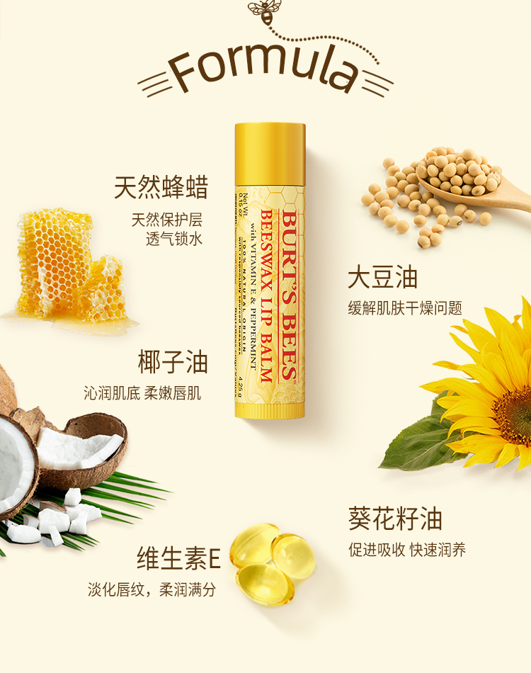 天然成分制作,蕴含抗氧化维生素E,椰子油,葵花籽油,蜂蜡精华,不含工业香精、化学色素、酒精和防腐剂,安全修护唇部损伤,舒缓干燥,高度滋润。